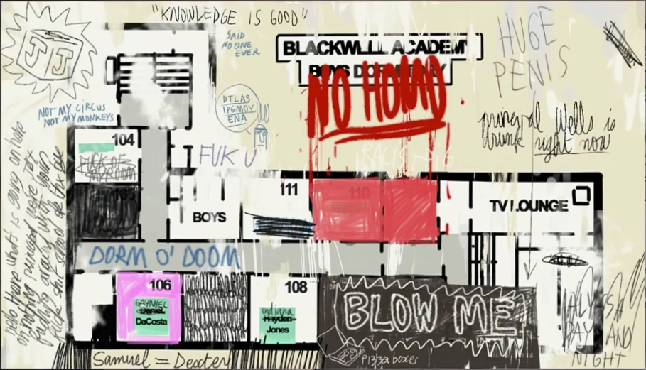 Б. Отдельное внимание ко главному входу и отдельная боль - мужское общежитие (комнаты парней  - на первом этаже). Во-первых, известная сценка: вреднючки не пропускают Макс, она подстраивает происшествие и проходит мимо них. Но... проходить некуда. Судя по планировке, там находятся две комнаты, никакого прохода между ними нет. Даже по загаженному плану этажа мальчиков это заметно (главный вход примерно там, где надпись красная No homo).