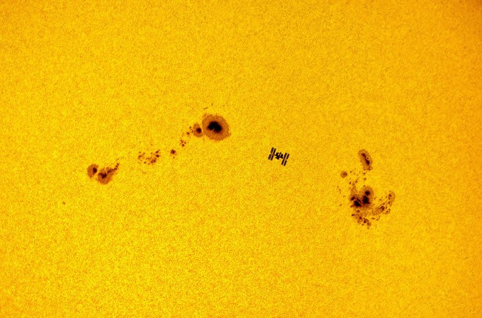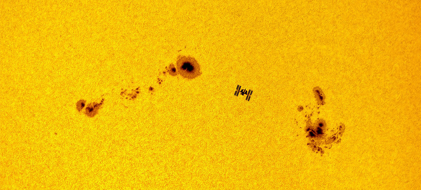 Астрофотография требует огромного терпения и планирования, а испанскому фотографу Дани Касете помогли еще и быстрые рефлексы. Его работа, отправленная на конкурс лучшего астрономического фото, представляет МКС на фоне Солнца, прямо между двумя группами гигантских солнечных пятен. Времени на съемки кадра было не много — станция двигается со скоростью 7.6 километра в секунду, так что проход перед звездой занимает всего 0.5 секунды.