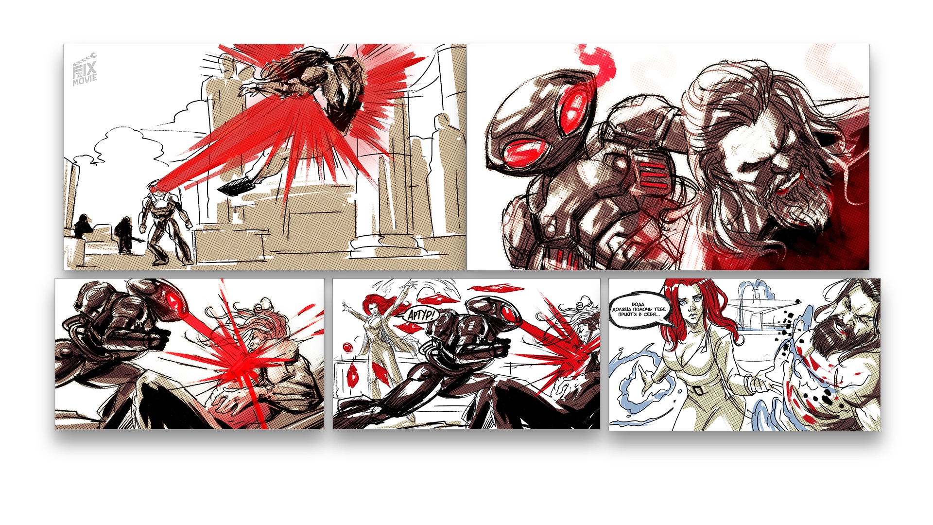 Мы отрисовали, как должен был складываться бой – без слов, рассказов о своих планах и с последствиями для Аквамена. В нашей версии он бы даже сам не выкарабкался, Мера бы спасла: