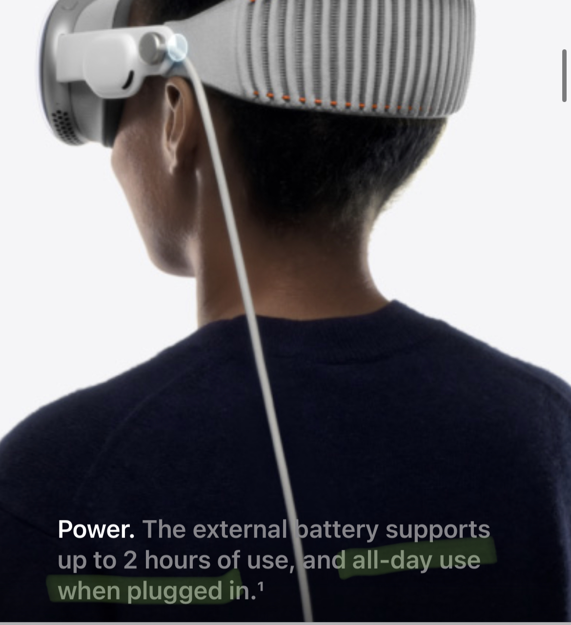 Презентация Apple подтвердила наличие проводного внешнего аккумулятора, который предполагается носить в кармане пользователя. Что касается продолжительности работы от аккумулятора, шлем может быть подключен для круглосуточного использования, но его внешний аккумулятор, подключаемый через кабель, сохраняет заряд, который может длиться около двух часов. Это сопоставимо с Meta Quest 2. Пока неизвестно, как Vision Pro будет конкурировать с предстоящими предложениями Meta Quest 3.
