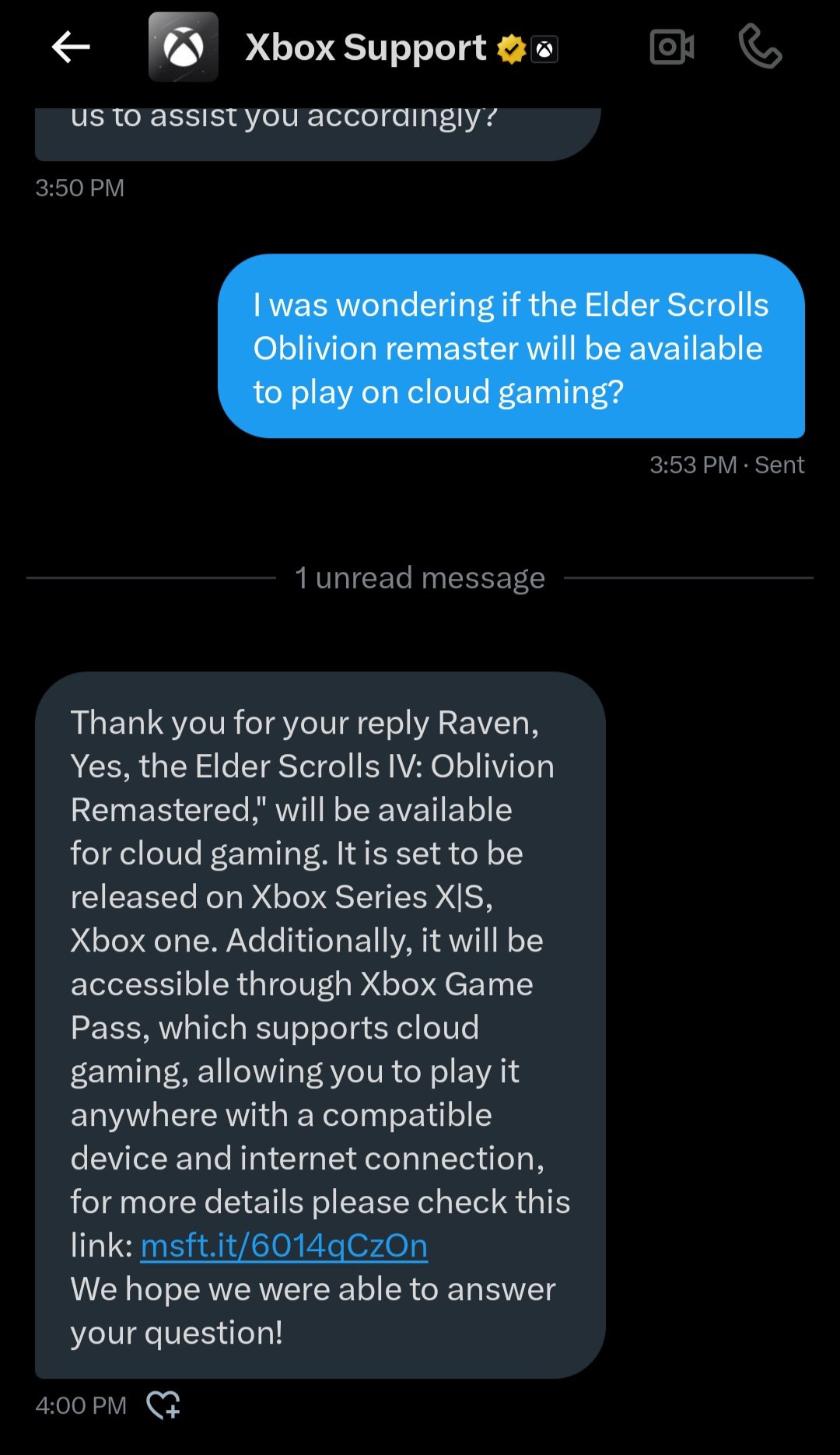 Этой датой поделился пользователь твиттера Ser_Raven18, который написал личное сообщение в техподдержку, спросив о возможности играть в The Elder Scrolls IV: Oblivion Remastered через облако. На это аккаунт ответил: