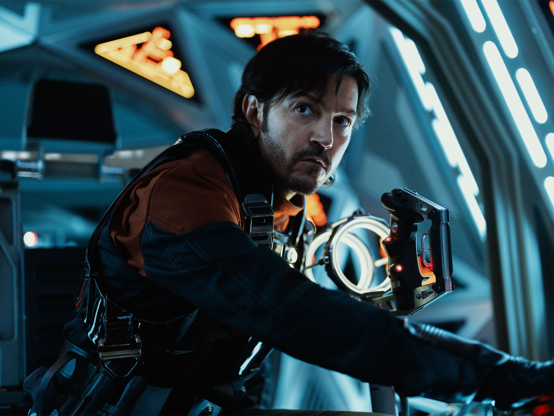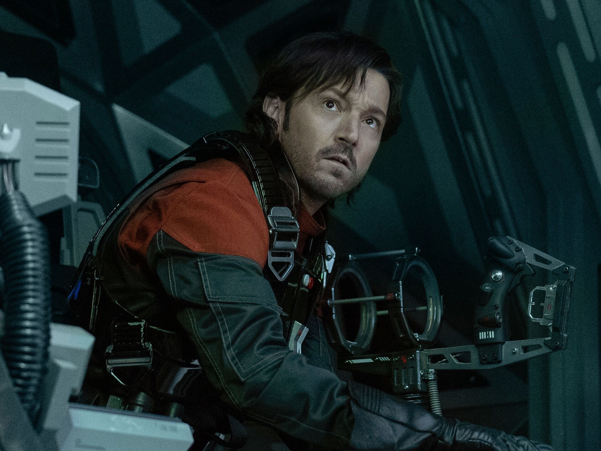 Диего Луна в роли Кассиана Андора снимается в полностью построенной кабине прототипа TIE Мстителя для сцены из второго сезона.