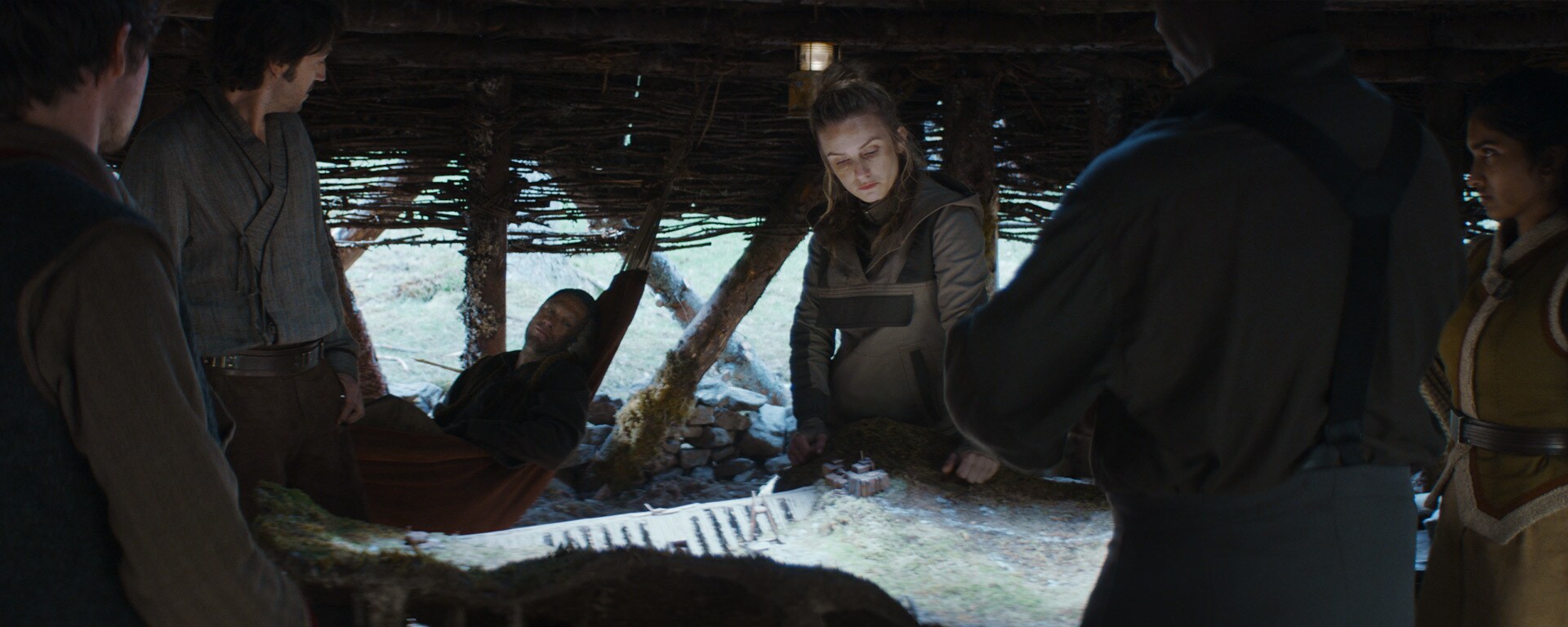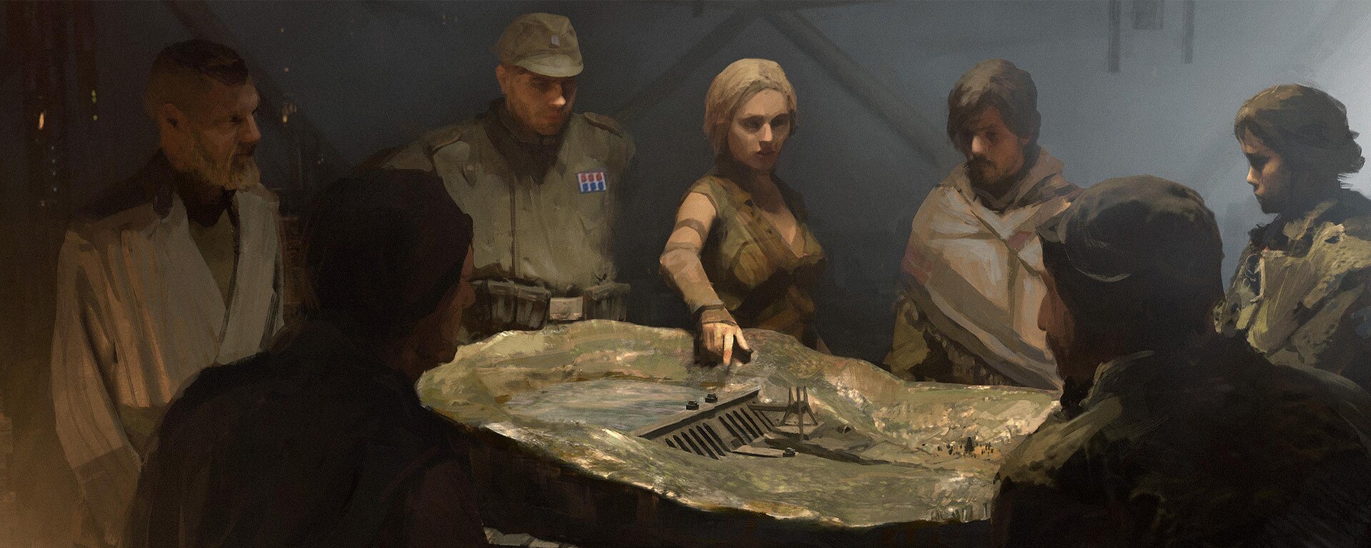 На концепт-арте Честера Карра команда налетчиков Альдани разрабатывает план, который позже воплощается в сцене под руководством Вел Сарты (Фэй Марсей).