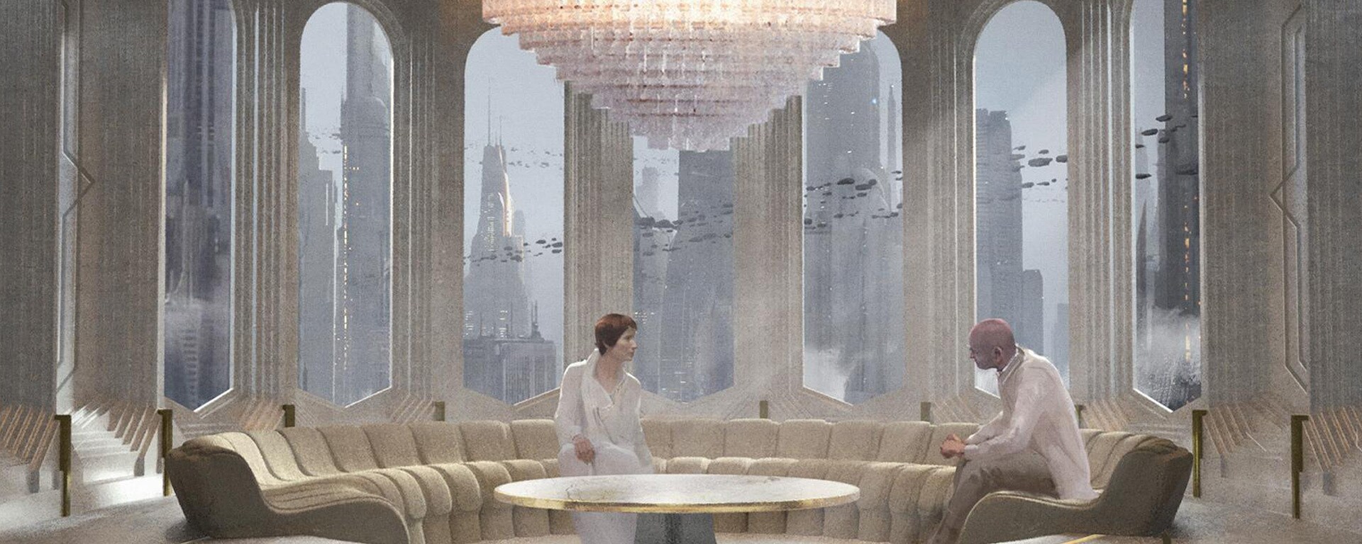 Концепт-художник Джорджио Греку представил напряженную встречу Мон Мотмы (Женевьев О'Райли) для обсуждения финансов как более камерное мероприятие.
