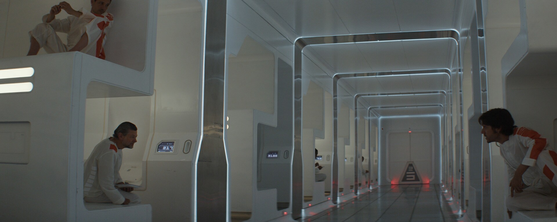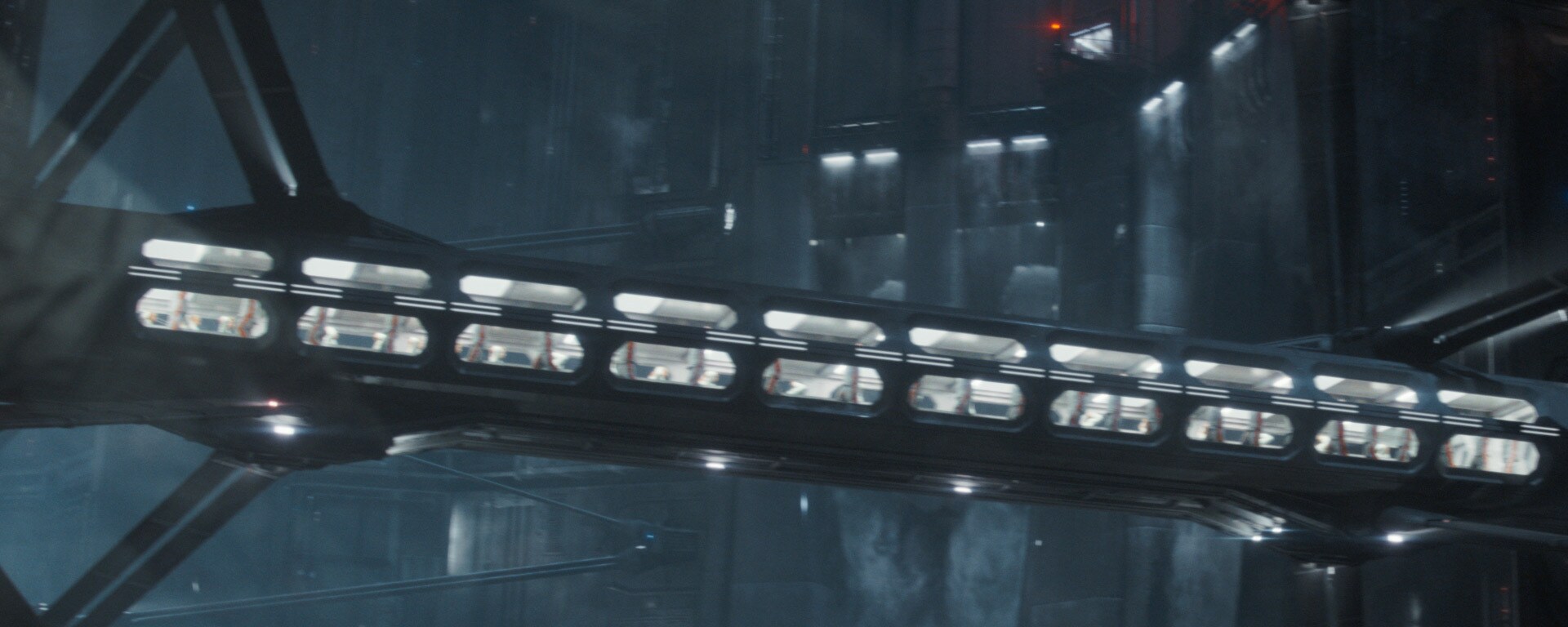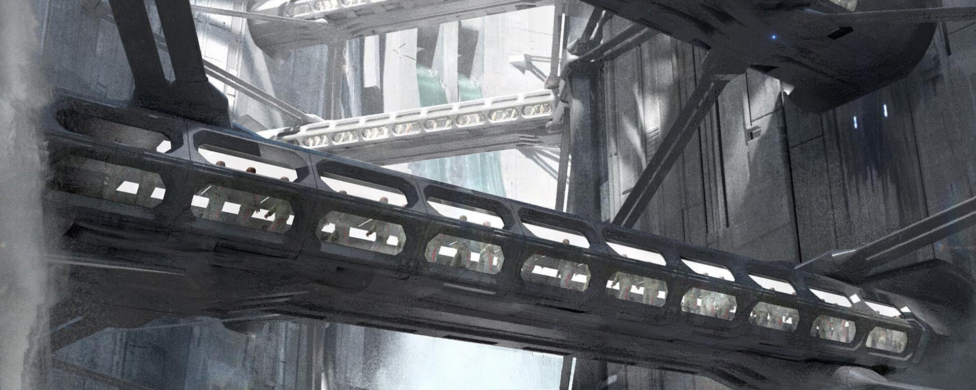Переходы, соединяющие камеры и рабочие зоны в тюрьме на Наркине 5, почти не изменились от концепт-арта Джорджио Греку до финального воплощения на экране.