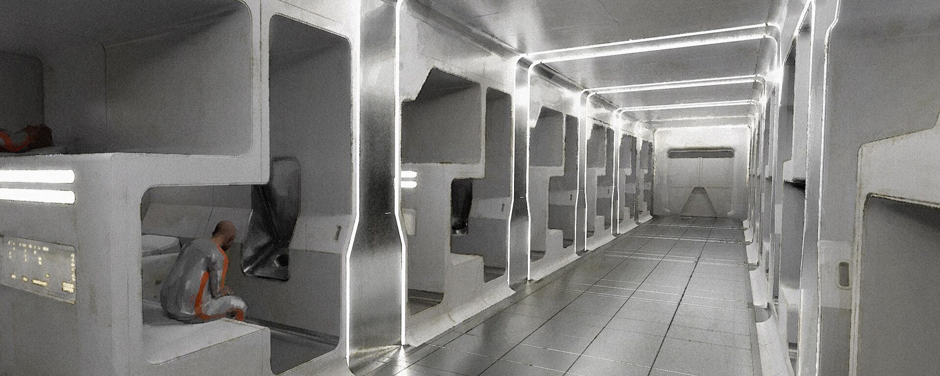 Тюремный блок на Наркине 5 изображен аскетичным и ярко освещенным на концепт-арте Честера Карра.