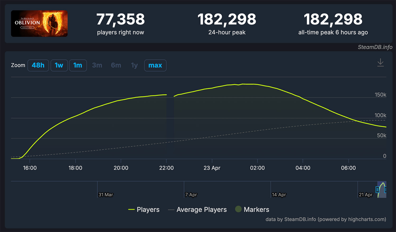Всего через несколько часов после выхода ремастера Oblivion, игра взлетела на вершину чартов Steam с пиковым показателем в 182,298 одновременных игроков согласно данным SteamDB. Это второй по величине пик среди всех одиночных игр, выпущенных в этом году, уступающий только Kingdom Come: Deliverance 2 с его 256,206 игроками.