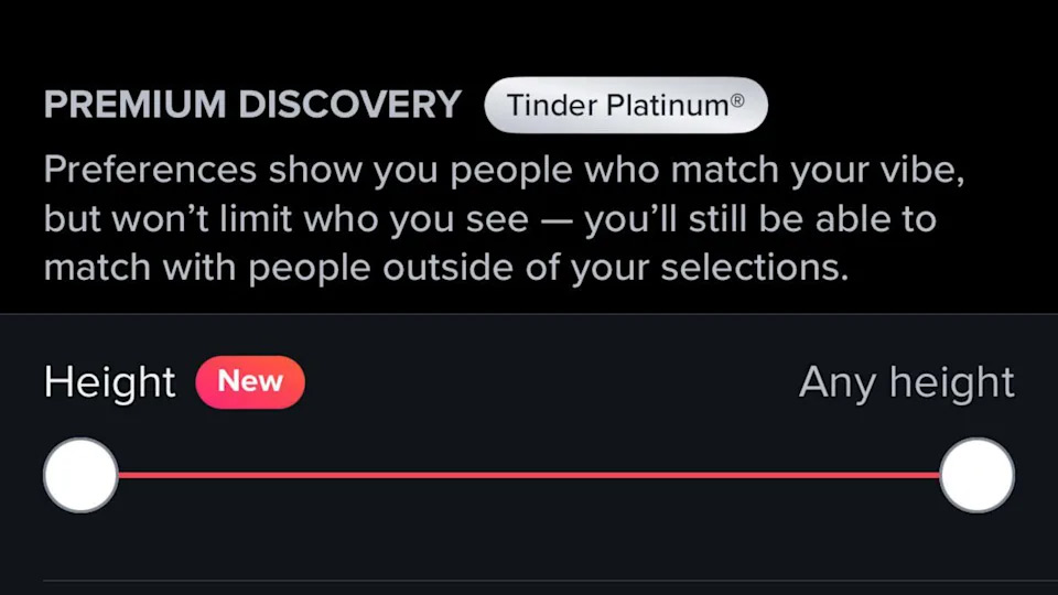 Match Group запустила тестирование новой функции в Tinder, которая позволяет подписчикам Gold и Platinum устанавливать предпочтения по росту потенциальных партнеров. Опция недавно была обнаружена в разделе Discovery Settings приложения и пока доступна ограниченному числу участников – похоже, ее выкатывают поэтапно.