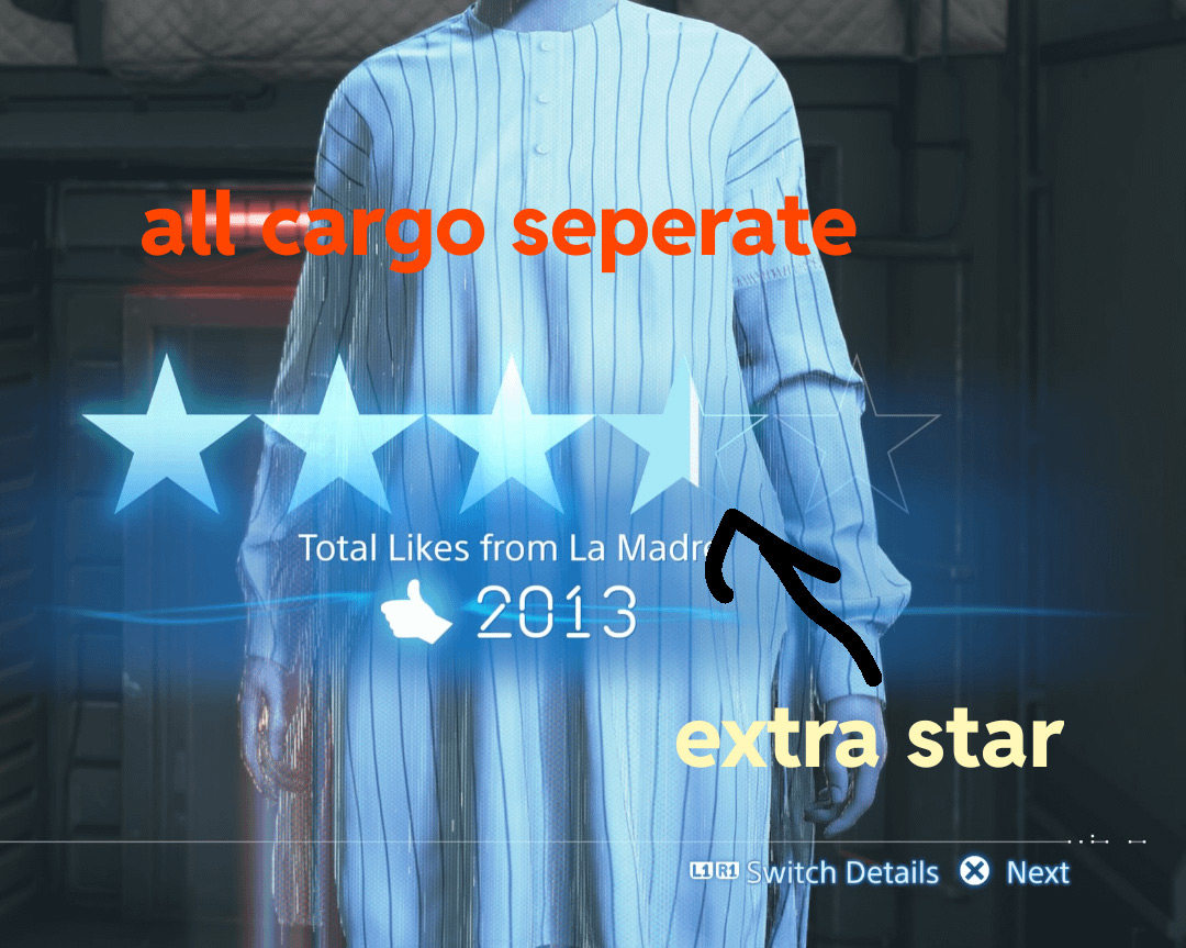 Один игрок уже выяснил, что доставка нескольких заказов или найденного груза одновременно фактически дает меньше звездного рейтинга, чем если доставлять каждый предмет отдельно и проходить через сцену доставки каждый раз. Пользователь продвинулся от двух с половиной звезд с La Madre до чуть менее трех звезд, когда всё было доставлено сразу, в то время как доставка каждой части отдельно подняла рейтинг до почти четырех звезд. Это очень значительный прирост.