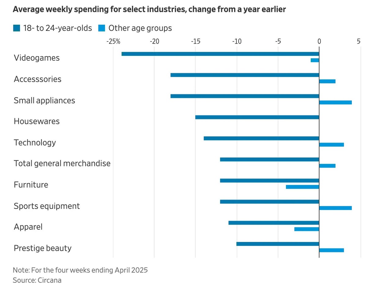 В более широком контексте, общие расходы этой возрастной группы в онлайн и обычных магазинах снизились на 13% в годовом исчислении в период с января по апрель 2025 года. Расходы других возрастных групп все еще растут, хотя и замедлились.