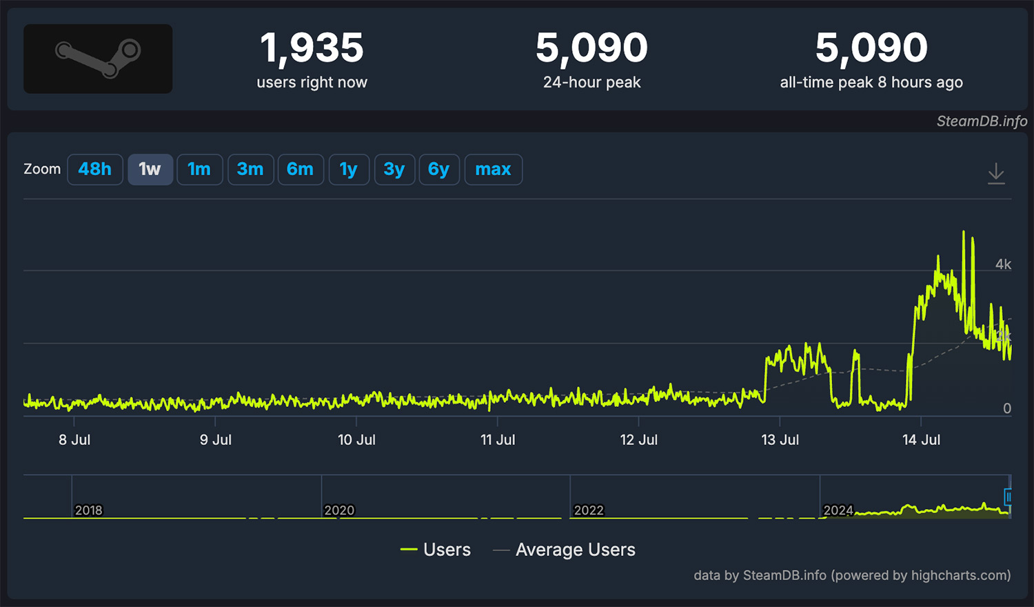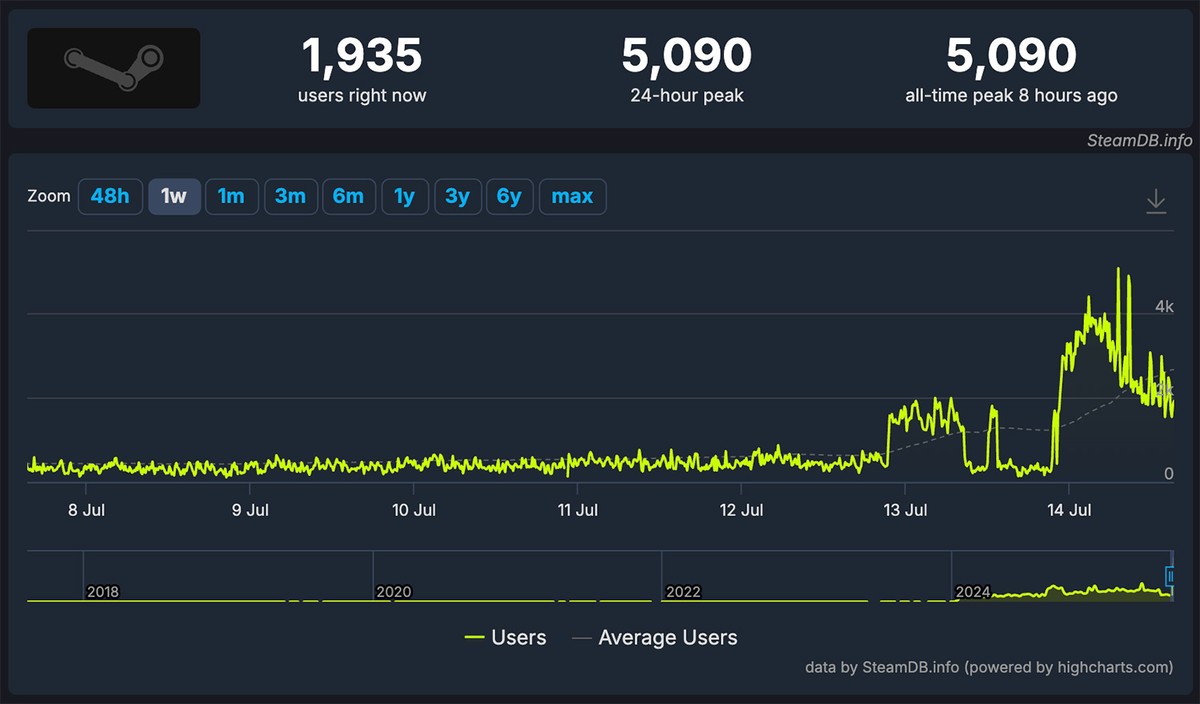 Судя по данным SteamDB, обычно Zombie Panic Source привлекает около 50 одновременных игроков. Однако 14 июля выделенные серверы игры неожиданно заполнились тысячами геймеров. Причина этого взрыва популярности может быть связана с неформальным ежегодным событием – около года назад, 13 июля 2024 года, сайт сообщества Half-Life и Source Engine под названием Lambda Generation организовал мероприятие, призывающее фанатов Zombie Panic Source войти в игру вместе в знак уважения к моду и его наследию.