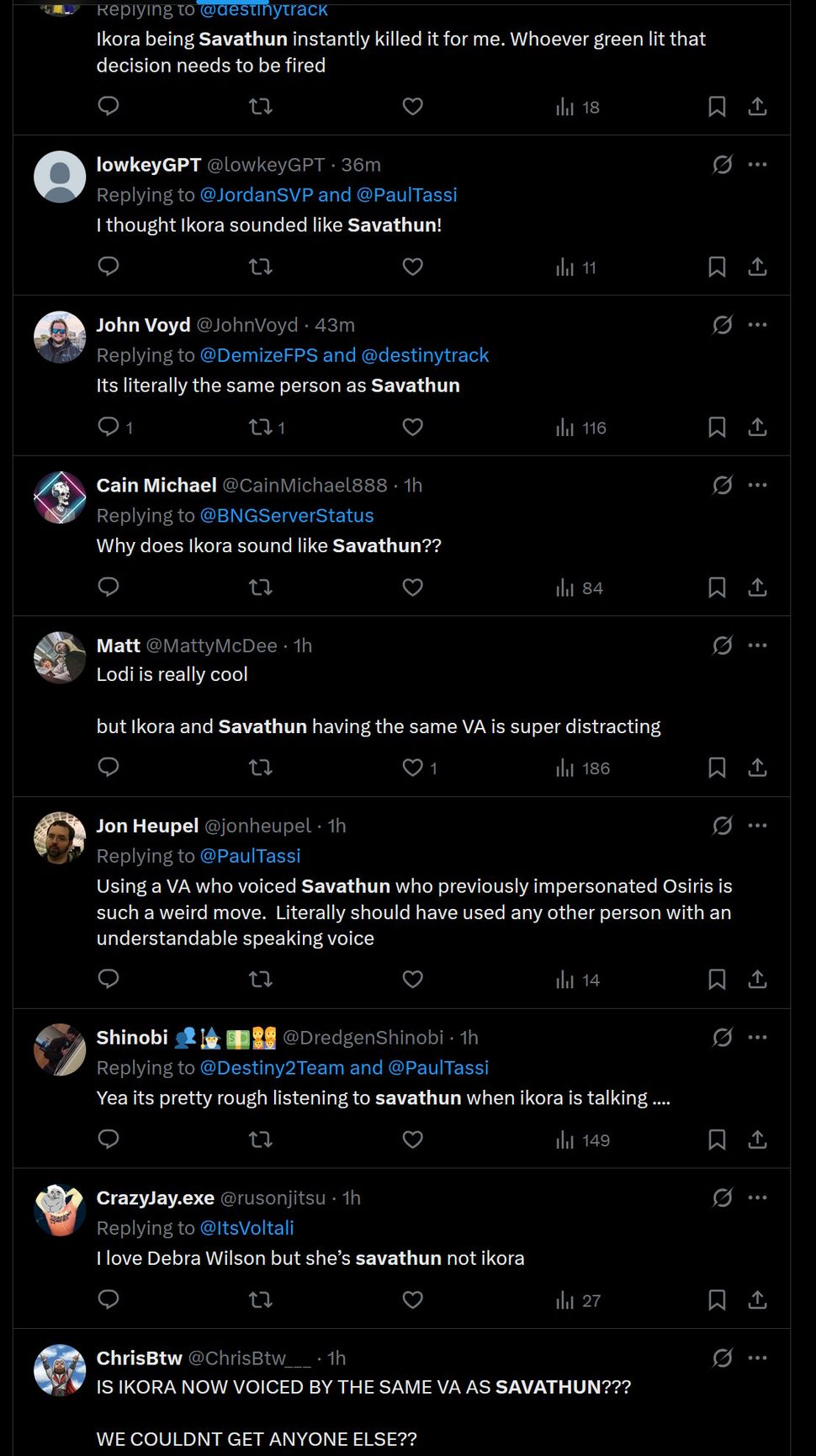 Ситуация усугубляется тем, что временной заменой стала Дебра Уилсон – актриса, ранее озвучившая Саватун в дополнении Destiny 2: The Witch Queen. Игроки сразу заметили сходство голосов, что создает определенный диссонанс при прохождении сюжетной кампании.
