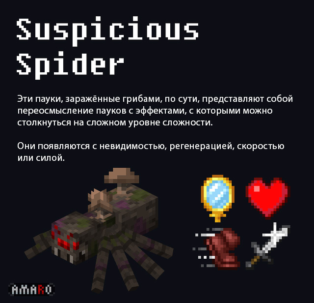 Пользователь Reddit под ником Sea_Honey_2747 поделился концепт-артами и описаниями, иллюстрирующими, как могли бы выглядеть варианты зомби, утопленника, иссушенного, крипера, паука и иссушенного скелета. В частности, эти дизайны включают то, что автор описал как "экипировку" для улучшения способностей мобов. По словам Sea_Honey_2747, идея проекта возникла из популярного предложения о том, чтобы зомби использовали двери в качестве щитов.