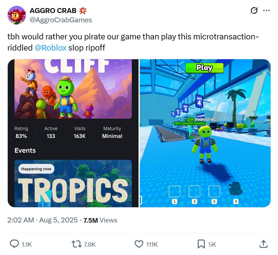 Студия Aggro Crab, создавшая Another Crab's Treasure и недавний кооперативный хит о выживании и скалолазании Peak, резко раскритиковала клон своего проекта на платформе Roblox. В сообщении на платформе Twitter/X разработчики заявили, что предпочли бы видеть пиратство собственной игры, чем популярность "этой начиненной микротранзакциями дешевой подделки в Roblox".