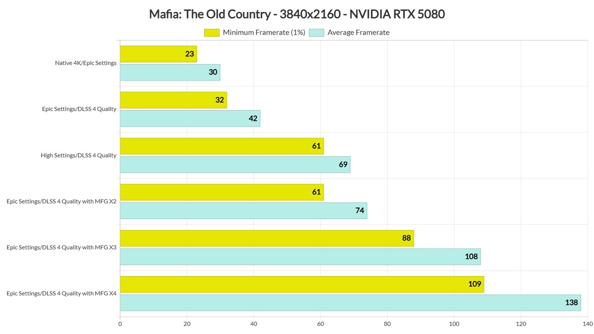 В общем, Mafia: The Old Country сейчас находится в странном положении. Эпические настройки недоступны практически для всех в нативном разрешении. Да, даже если у вас RTX 5090. Единственный способ получить больше 60 FPS на этих настройках – это DLSS 4 и Frame Gen. Но DLSS 4 и Multi-Frame Gen сейчас имеют множество визуальных проблем. Поэтому лучший способ играть – с TSR (а использовать DLSS Frame Gen с TSR в этой игре нельзя).
