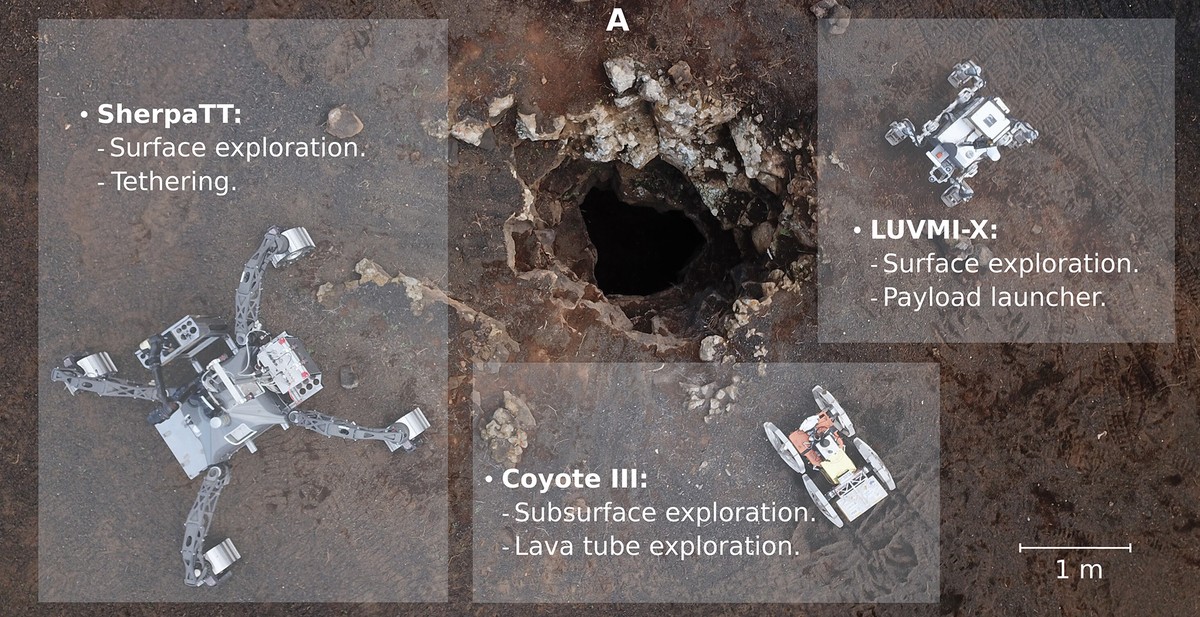 Международная команда исследователей представила специализированных роботов, способных спускаться в подземные полости на Марсе и Луне. Роботизированные системы уже успешно прошли испытания на испанском острове Лансароте, где одна система помогала другой спускаться в вертикальную шахту подземной пещеры.