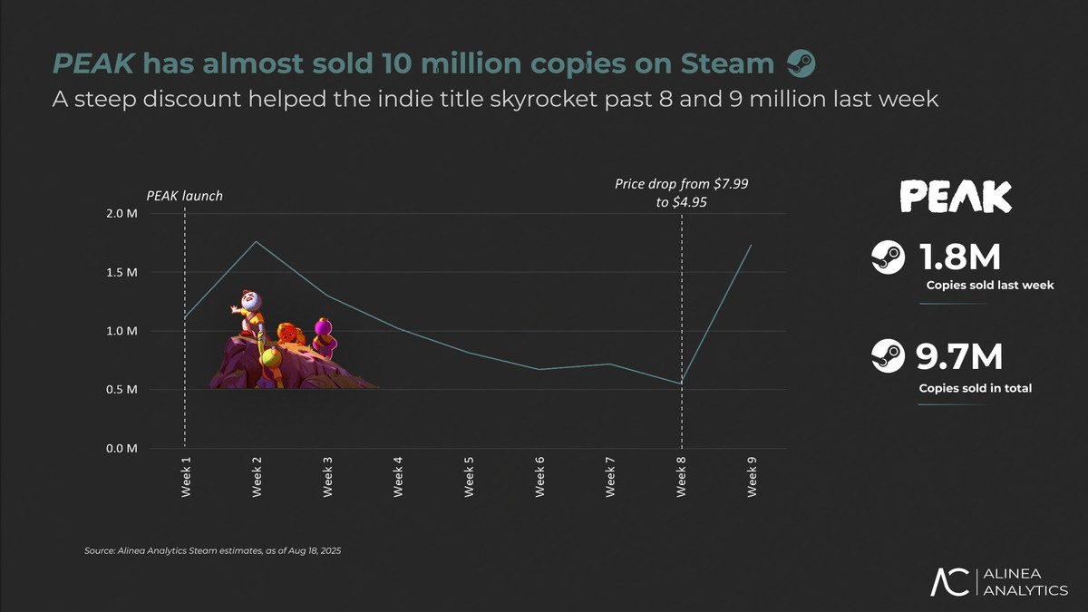 Выживалка Peak продолжает покорять вершины популярности – за прошедшую неделю во время распродажи на Steam игра разошлась тиражом почти в два миллиона копий, вплотную приблизившись к знаковому рубежу в 10 миллионов проданных экземпляров.