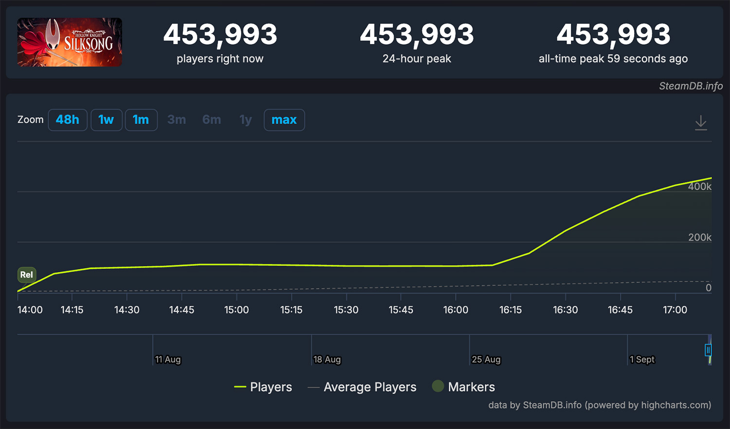 Hollow Knight: Silksong произвела фурор сразу после релиза, захватив третье место в Steam по числу активных игроков, уступая только CS2 и Dota 2. Одиночная двухмерная метроидвания от Team Cherry собрала более 453 тысяч игроков – и это только на одной платформе. С учетом консолей, число игроков может превышать полтора-два миллиона.