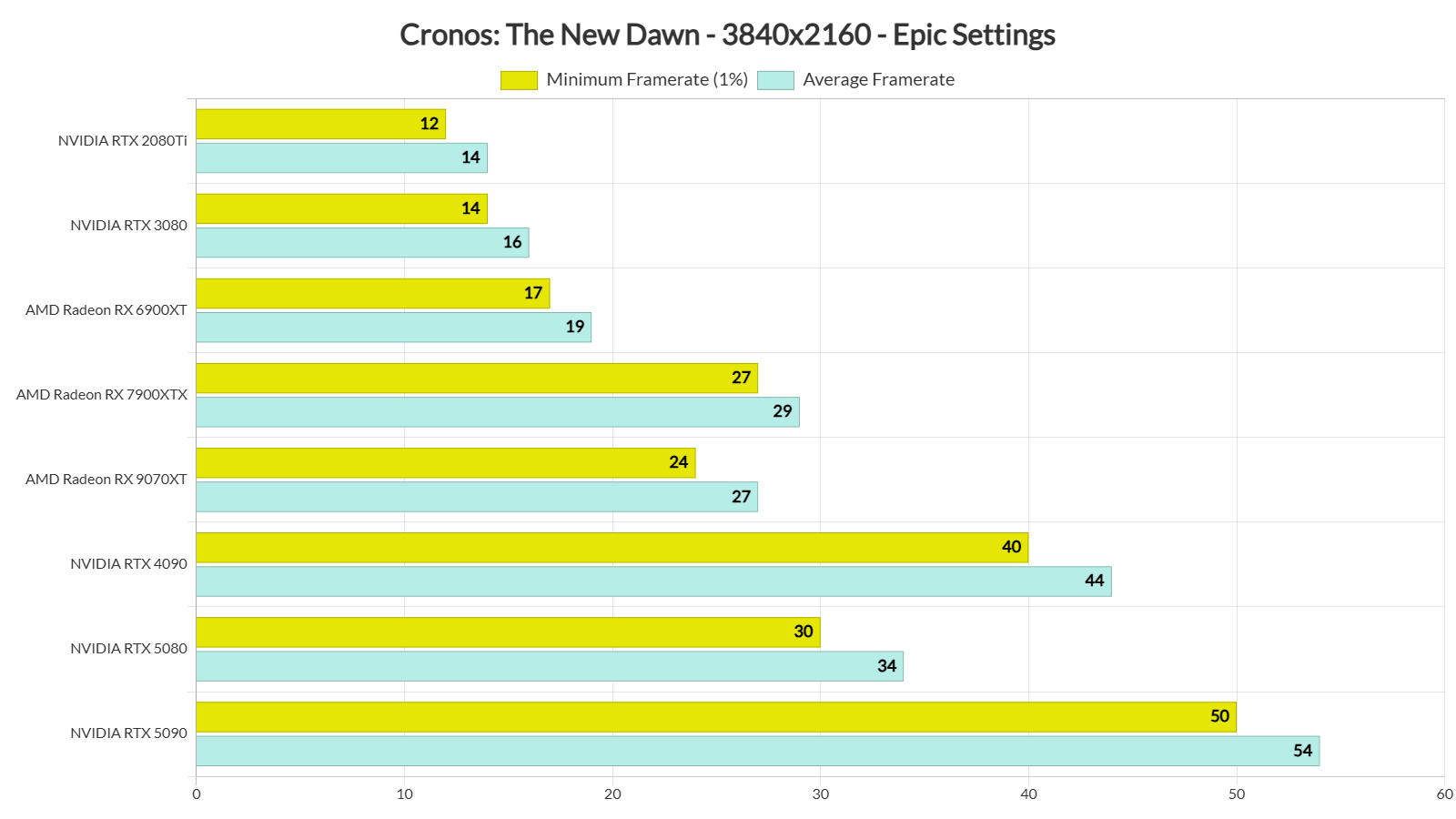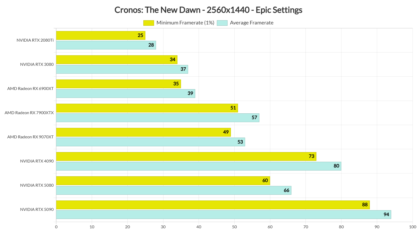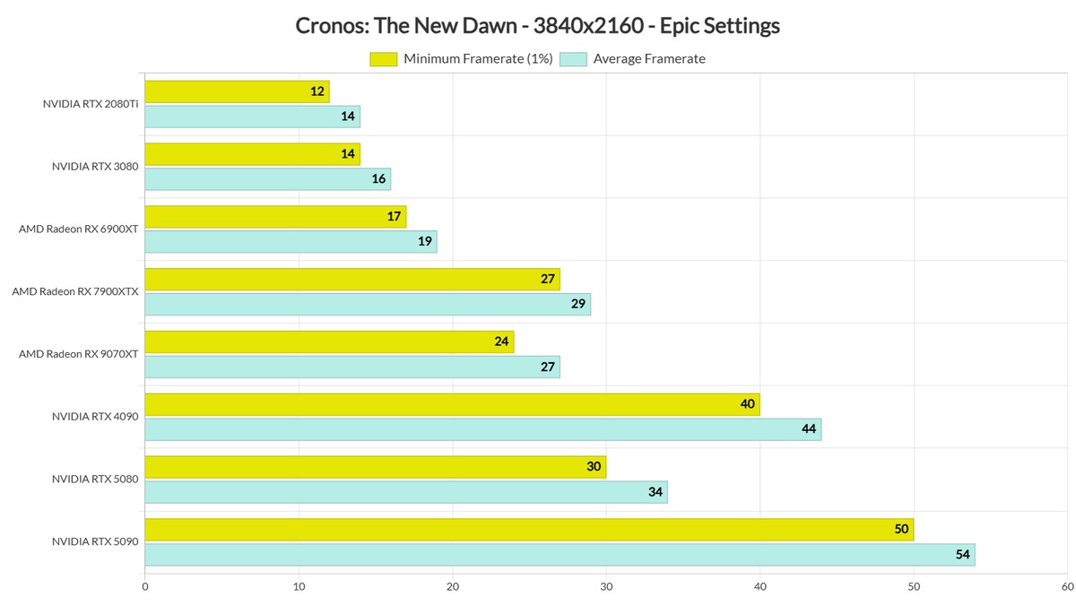 Журналисты из DSOGaming продолжают тестировать видеоигровые новинки. На этот раз их длинные руки дотянулись до хоррора Cronos: The New Dawn. Для тестов использовались процессор AMD Ryzen 9 7950X3D, 32 ГБ DDR5 с частотой 6000 МГц, а также видеокарты RX 6900XT, RX 7900XTX, RX 9070XT, RTX 2080Ti, RTX 3080, RTX 4090, RTX 5080 и RTX 5090.