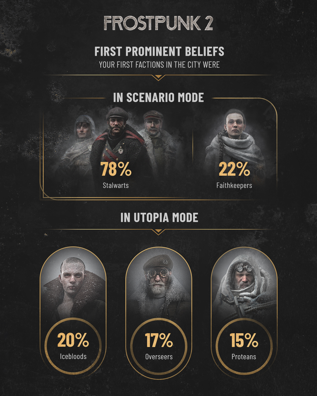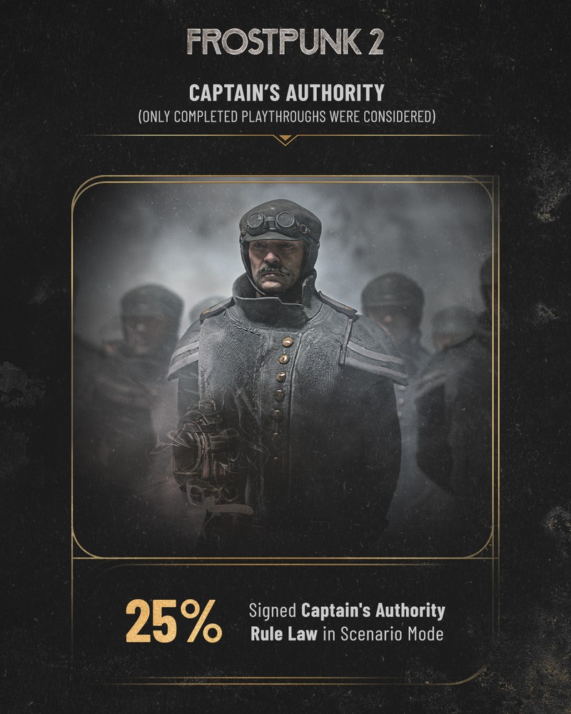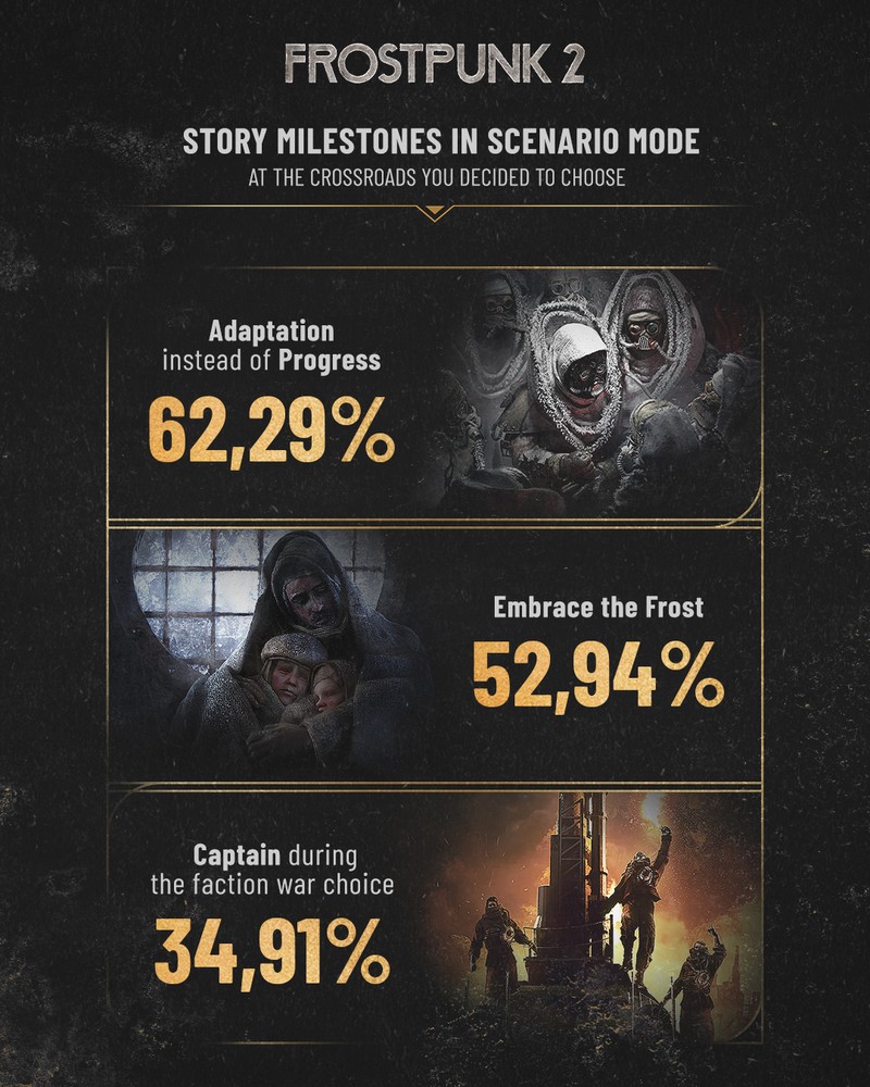 Студия 11 bit studios опубликовала детальную статистику игроков за первые двенадцать месяцев с момента релиза Frostpunk 2. Стратегия о выживании в постапокалиптическом мире дебютировала в сентябре прошлого года, и теперь разработчики готовы поделиться достижениями сообщества.