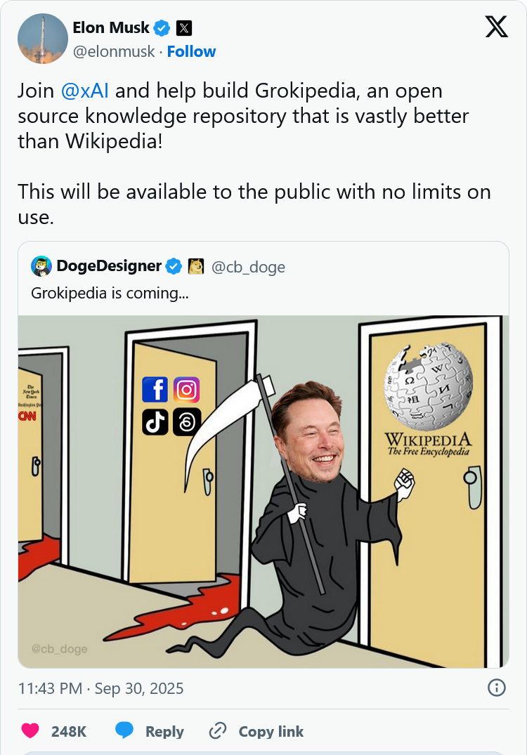 Илон Маск объявил о планах создания альтернативы Wikipedia под названием Grokipedia. Глава компании xAI сообщил в социальной сети, что новый проект станет "масштабным улучшением по сравнению с Wikipedia" и представляет собой "необходимый шаг к цели xAI – пониманию Вселенной". Миллиардер давно критикует популярную онлайн-энциклопедию, называя ее слишком "левой" и неоднократно использовая в отношении нее термин "Wokipedia".