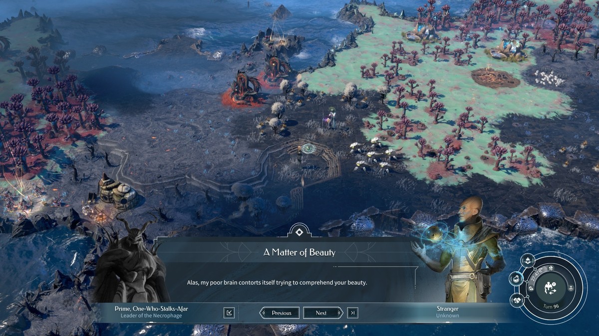 Многие игроки, проходившие некрофагов в первой части, объяснили концепцию фракции. UAnchovy напомнил, что в Endless Legend лидер Тот-Кто-Вмешивается (He-Who-Meddles) был трагичным персонажем – единственным некрофагом, способным к рефлексии, который понимал, что его народ никогда не изменится. Разработчики создали историю о постепенном осознании, что некрофагов создали убивать и пожирать, и они не могут стать чем-то большим. В Endless Legend 2 лидер Тот-Кто-Крадётся-Издалека (Stalks-From-Afar) продолжает эту линию, но система диалогов хуже раскрывает концепцию.
