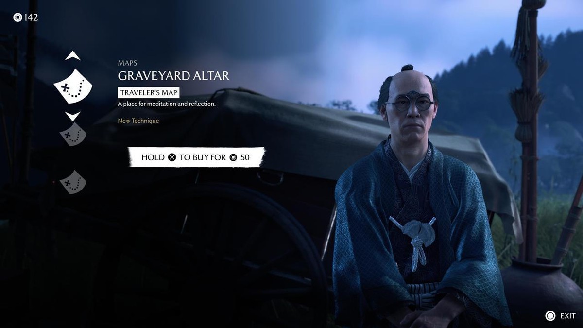 Расположение Алтарей Размышлений можно обнаружить Подзорной трубой при должном терпении. Альтернативный способ – покупка Карт путешественника (Traveler's Maps) у Исабуро-картографа в Старой гостинице. Исабуро иногда продаёт карты, которые ведут к другим наградам – талисманам и улучшениям персонажа.