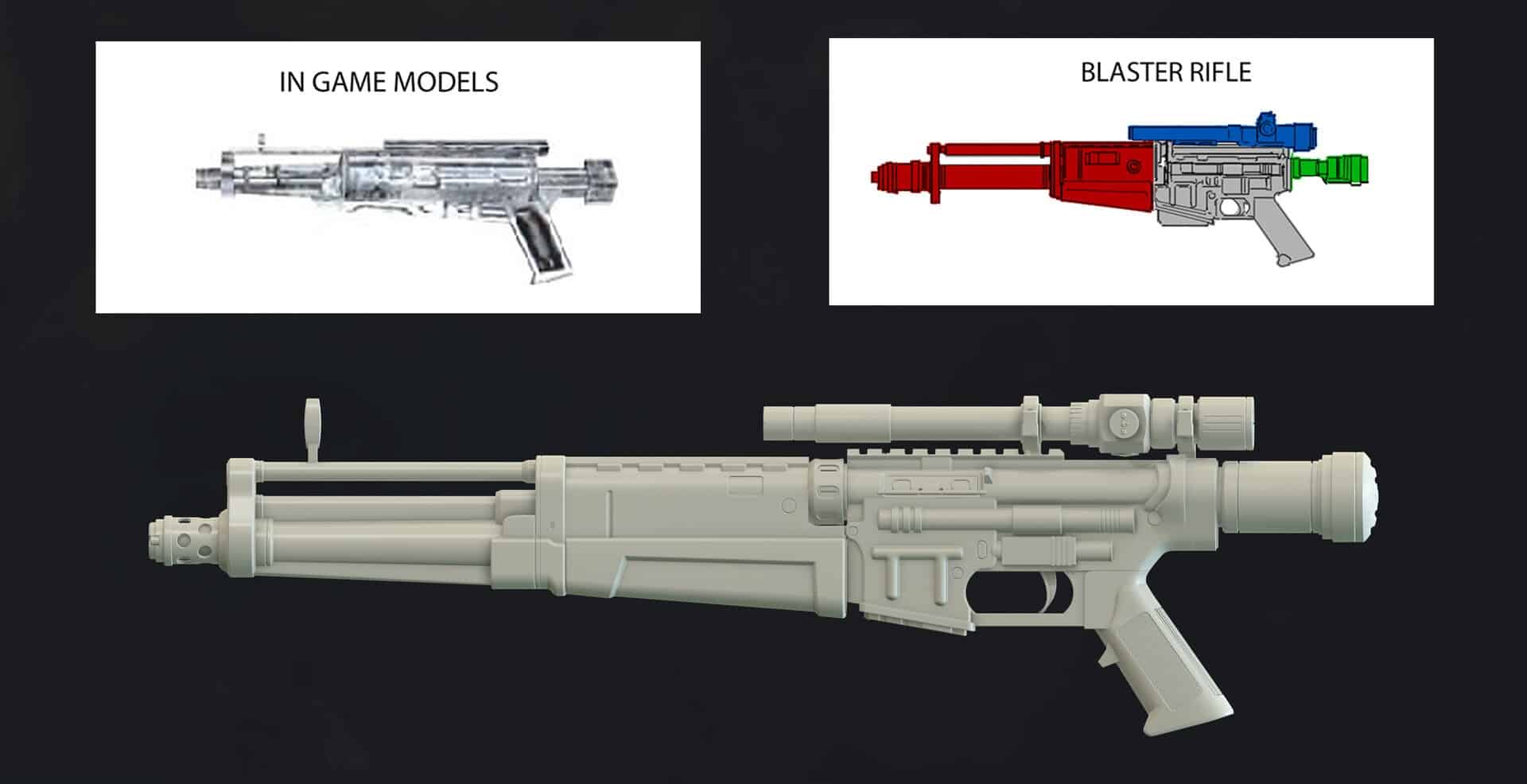Особый интерес представляет информация о модульной системе оружия. Разработчики планировали позволить игрокам улучшать огнестрельное оружие путем замены отдельных компонентов. На одном из изображений четко видна такая система на примере бластерной винтовки, где различные части можно было менять для кастомизации характеристик.