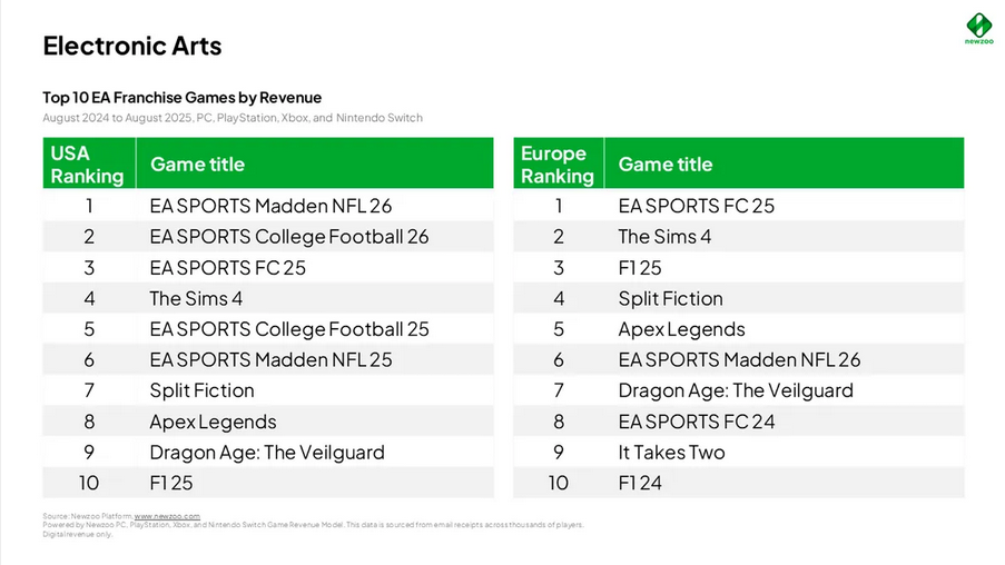По данным компании, основные деньги для EA приносят спортивные игры, но и Split Fiction отлично себя показала, да и Veilguard на уровне Apex Legends в США находится.