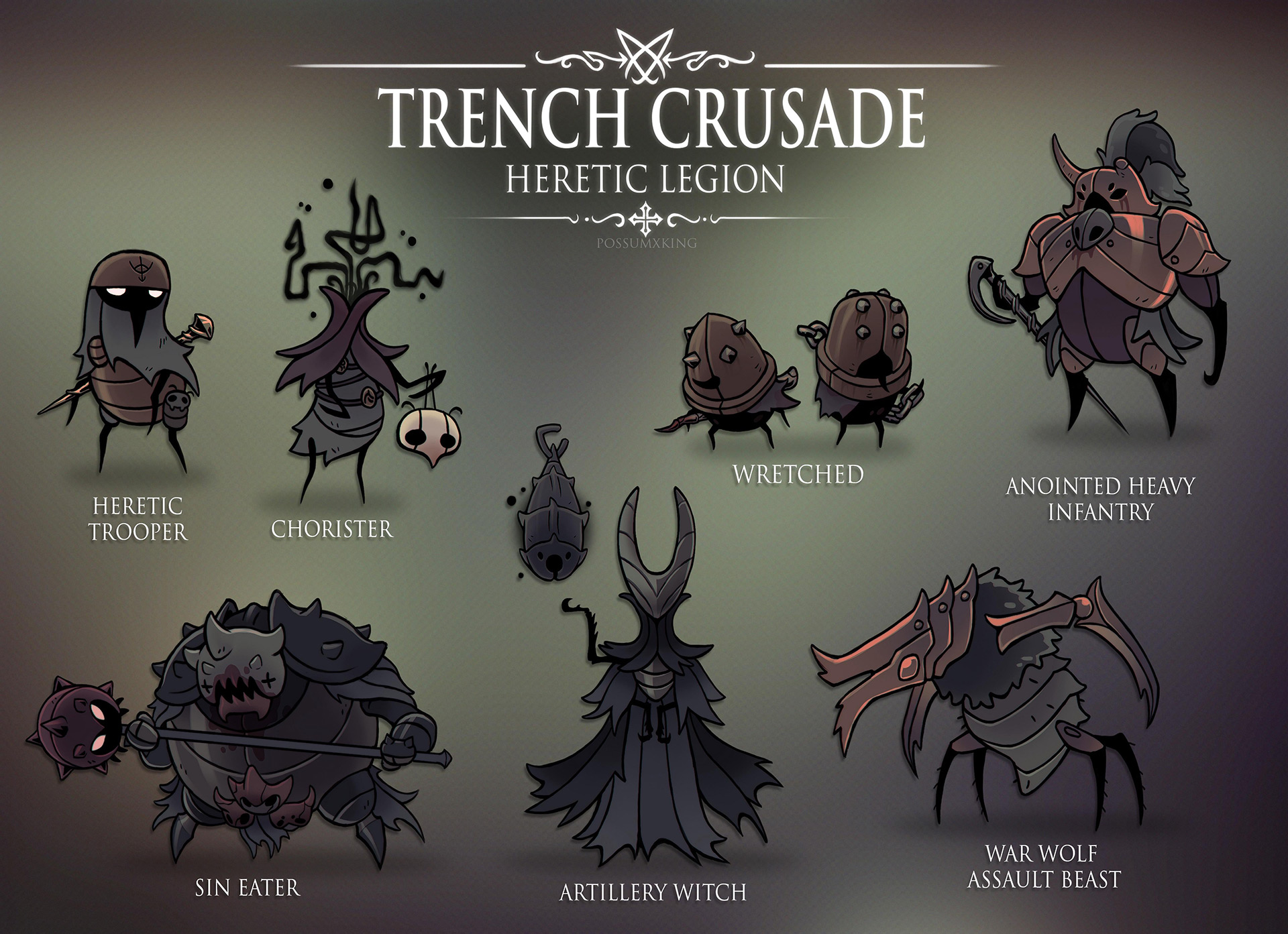 В концепт вошли Heretic Trooper (Еретический солдат), Chorister (Хорист), Sin Eater (Пожиратель грехов), Artillery Witch (Артиллерийская ведьма), War Wolf Assault Beast (Боевой зверь-волк), Anointed Heavy Infantry (Помазанная тяжёлая пехота) и Wretched (Жалкие). Каждый персонаж сохраняет характерные черты оригинальных миниатюр Trench Crusade, но адаптирован под эстетику метроидвании с акцентом на насекомоподобные формы и мрачную палитру.