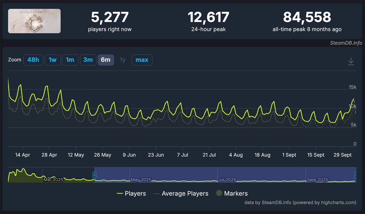 Исторические пики также демонстрируют разрыв: Civ 5 достигла 91 000 игроков 12,5 лет назад, Civ 6 – 162 000 девять лет назад, а Civ 7 показала максимум в 84 000 восемь месяцев назад при релизе. Учитывая столь большой разрыв между релизами, нынешнее состояние стратегии откровенно удручает.