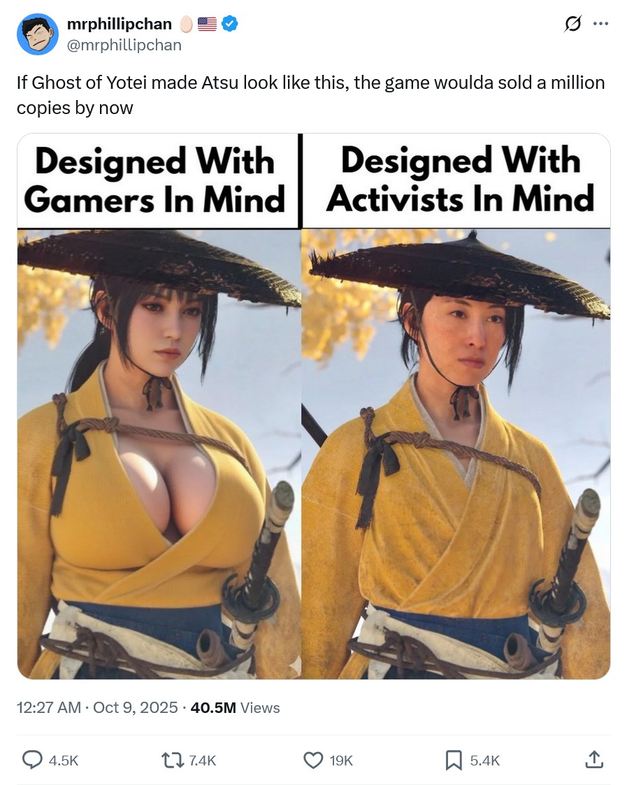 В X (Twitter) завирусился пост пользователя mrphilipchan, в котором тот утверждает, что Ghost of Yotei продалась бы лучше, если бы главная героиня тайтла Ацу выглядела бы как азиатская бимбо-красотка с огромной грудью и смазливым личиком.