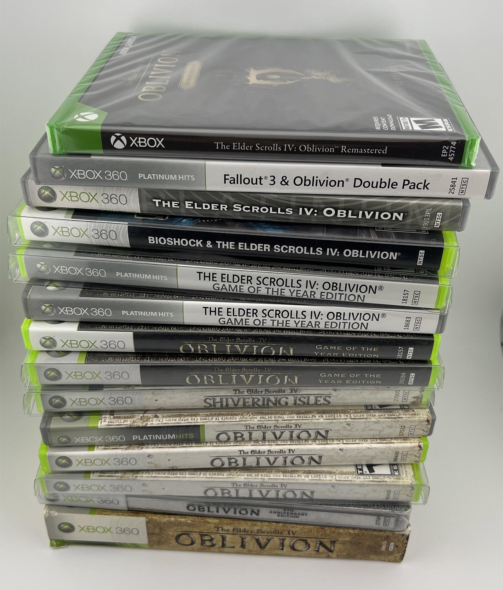 Коллекция включает 14 различных изданий игры, почти все из которых выпущены для Xbox 360. Среди них стандартные версии, издания Game of the Year, Platinum Hits, 5th Anniversary Edition, а также необычные бандлы – Fallout 3 & Oblivion Double Pack и BioShock & The Elder Scrolls IV: Oblivion. Верхушку стопки венчает свежий ремастер The Elder Scrolls IV: Oblivion Remastered для Xbox One.