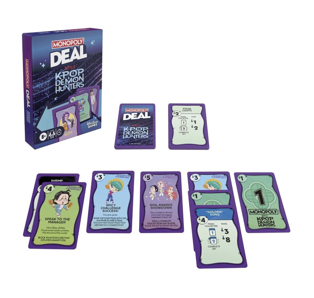 Первым товаром от Hasbro станет карточная вариация настольной игры Monopoly Deal под названием KPop Demon Hunters. Игра уже доступна для предзаказа на Amazon, Target и Walmart с отгрузкой с 1 января 2026 года.
