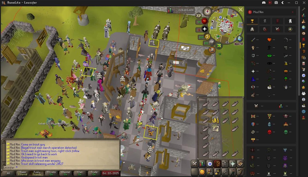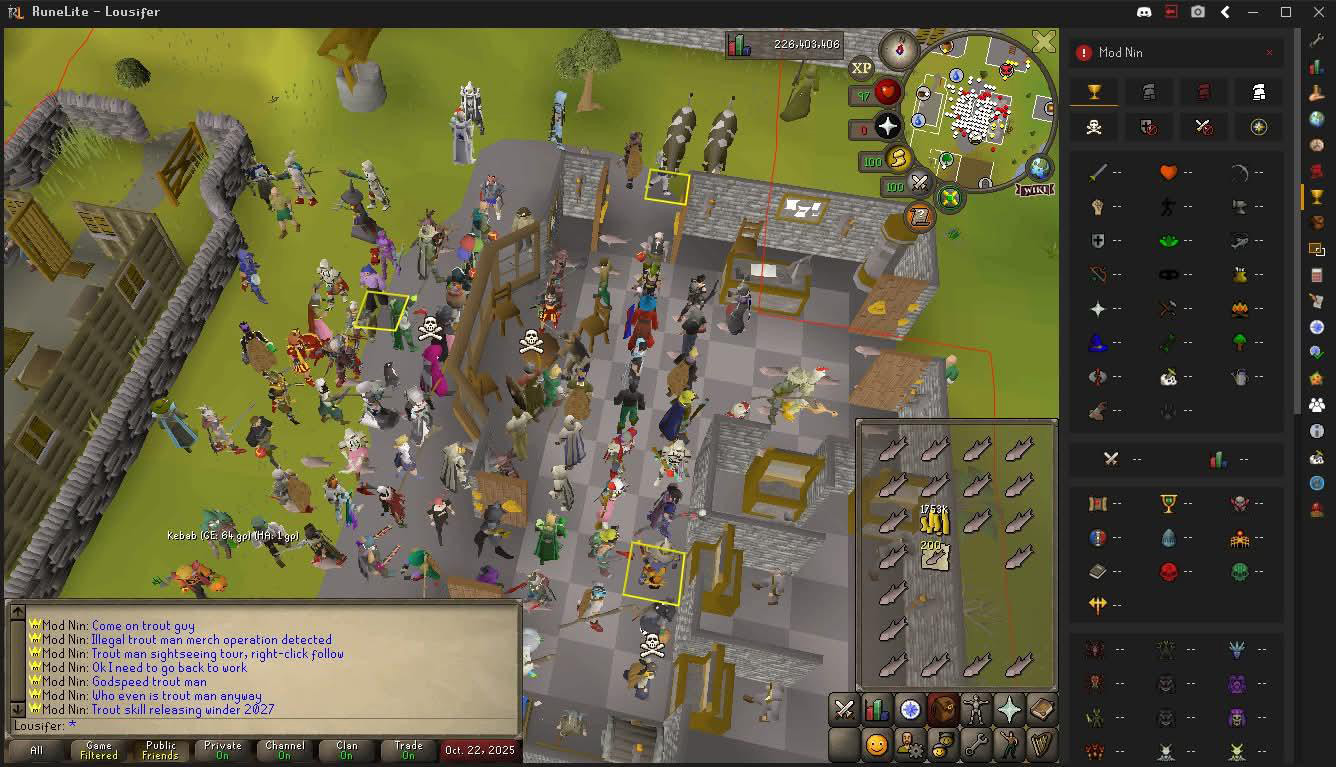 Эджвилль настолько заполнен паломниками, несущими рыбу для Lousifer, что в какой-то момент сам герой опубликовал скриншот на сабреддите, демонстрируя не только инвентарь, забитый форелью, но и модератора Jagex, пришедшего пожелать ему удачи.