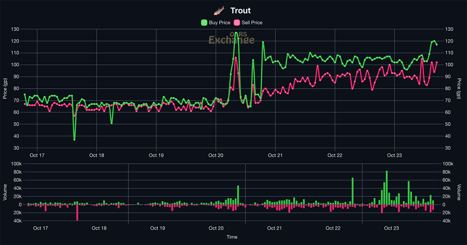 Это вполне возможно. На osrs.exchange виден массивный скачок цен на форель, которые почти удвоились 20 октября с 70 до 120 золотых. Если принять этот пятидневный период за основу, получается, что форелевый парень, потенциально хитрый поедатель рыбы, два дня поглощал форель для получения известности, дождался истощения рыбного рынка, затем перевел пожертвованную рыбу на альтернативный аккаунт и продал её по более высокой цене.