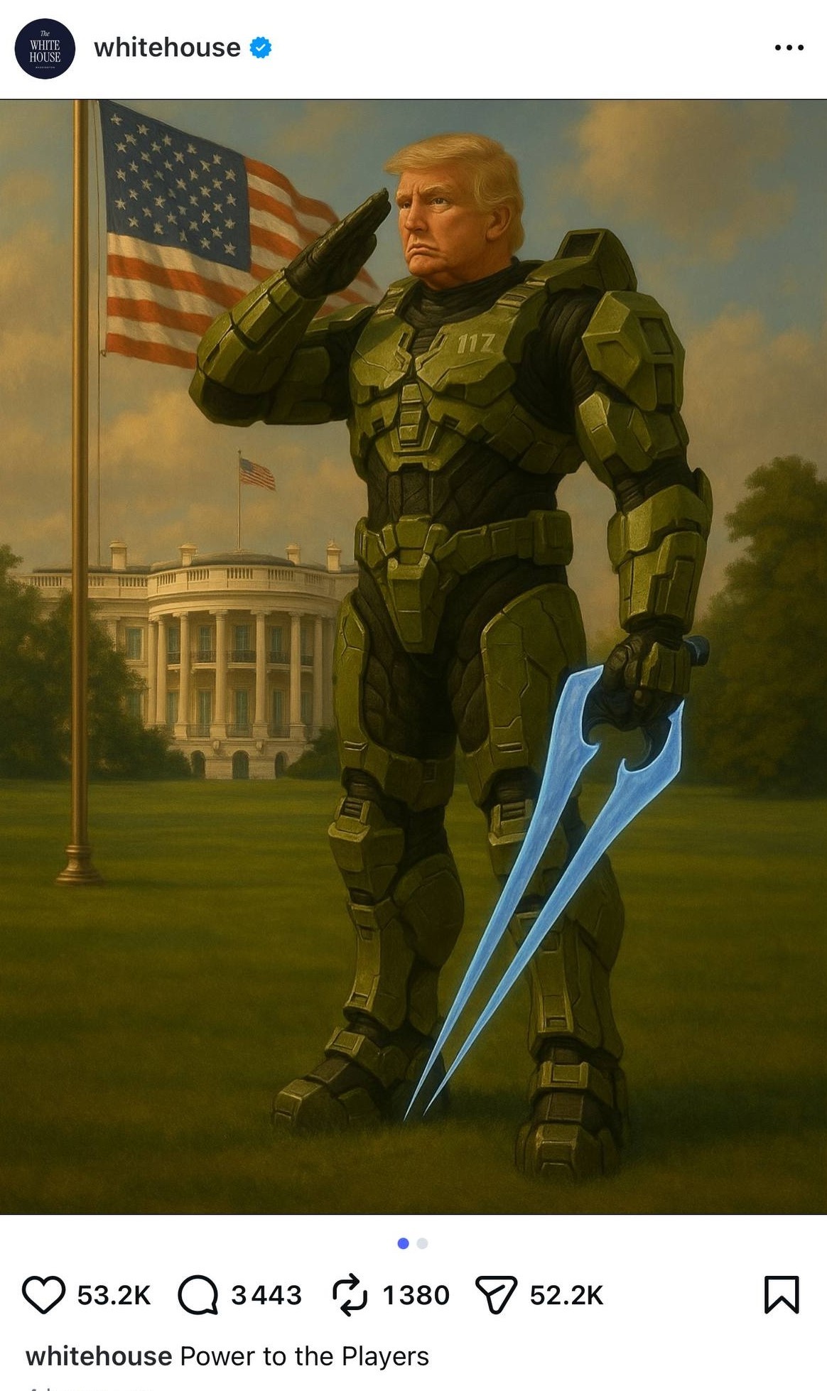 Примечательно, что даже Белый дом подхватил эту идею и опубликовал изображение Дональда Трампа в костюме Мастера Чифа, что стало неожиданным политическим откликом на игровые новости. Естественно, Трамп хочет остаться миротворцем, поэтому и такой "мир" приписал в шутку себе. Надеемся, что в шутку.