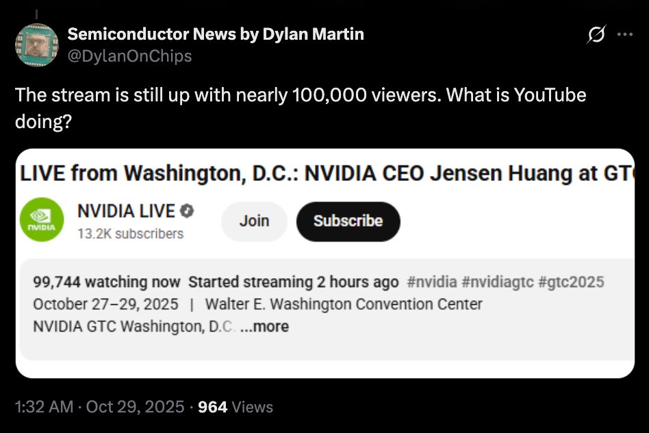 Редактор CRN Дилан Мартин опубликовал в твиттере наблюдения за происходящим в реальном времени, отметив, что на пике официальная трансляция собирала лишь пятую часть аудитории фейкового стрима. ИИ-версия Хуанга заявила об отмене основного мероприятия в пользу "события по массовому внедрению криптовалют, которое напрямую связано с миссией Nvidia по ускорению прогресса человечества".