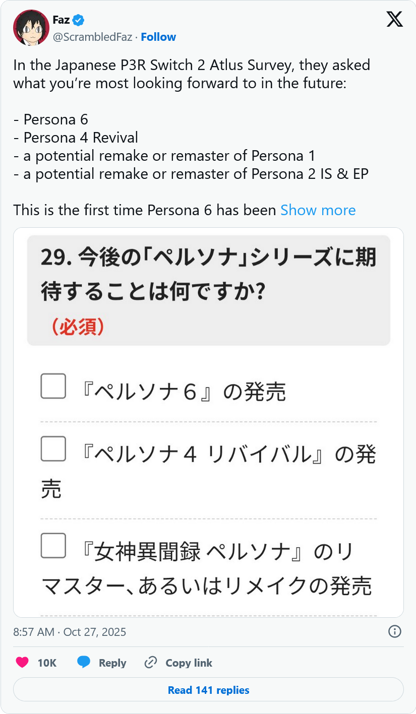 Спустя более четырех лет дочерняя студия Sega снова упомянула Persona 6, причем на этот раз упоминание оказалось еще более непринужденным. Отсылку обнаружили в опросе, разосланном японским владельцам версии Persona 3 Reload для Switch 2, вышедшей 23 октября. Особый интерес представляет вопрос под номером 29, где респондентам предлагается выбрать один или несколько тайтлов Persona, которые они ожидают увидеть в будущем. Среди вариантов значатся Persona 6, Persona 4 Revival и модернизированные версии первых двух основных частей серии.