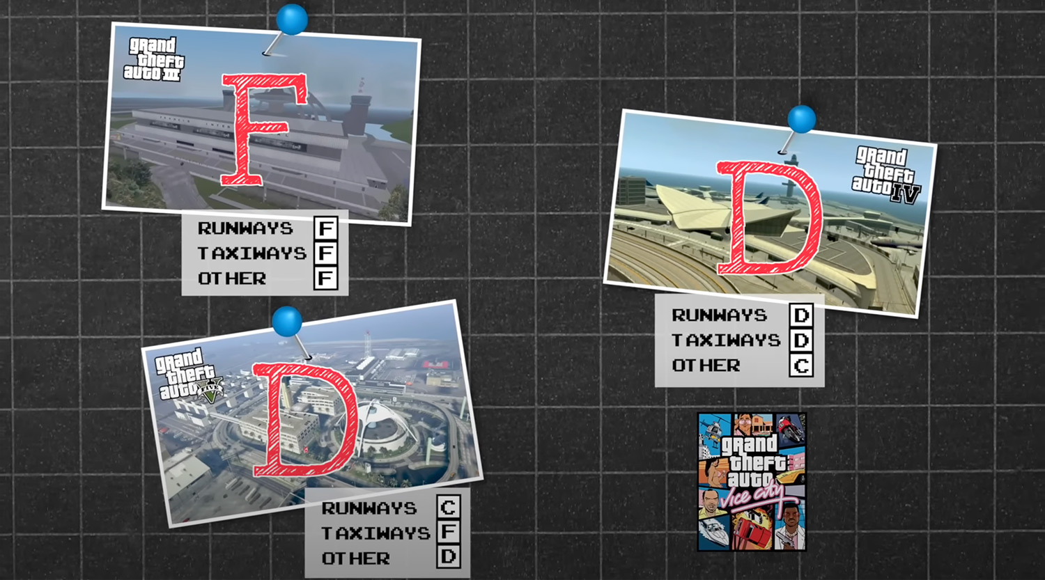 Остин проанализировал три крупных аэропорта из GTA 3, GTA 4 и GTA 5, оценивая их по трем категориям: