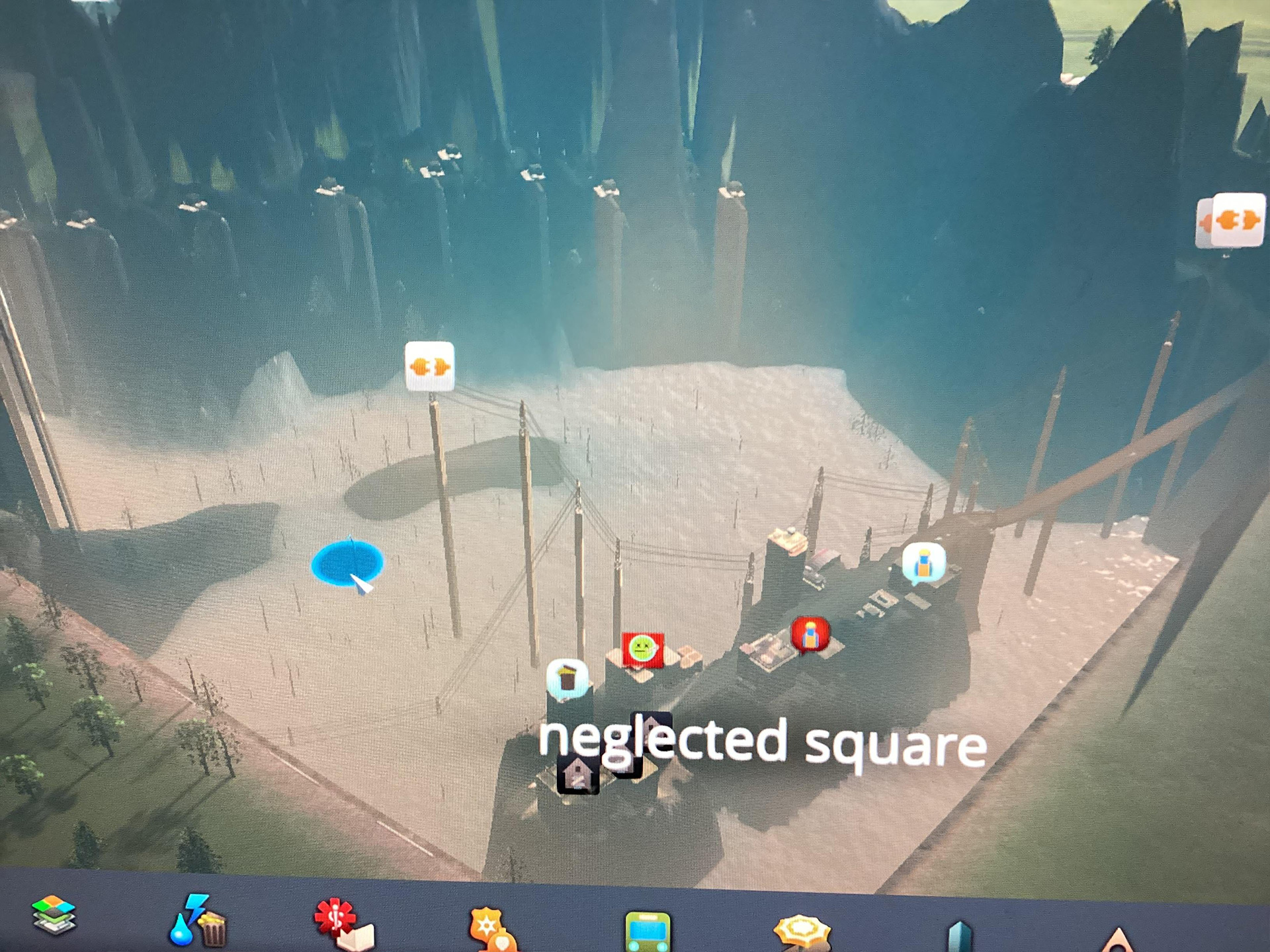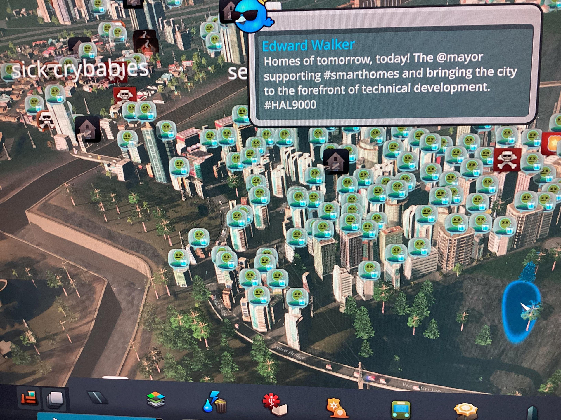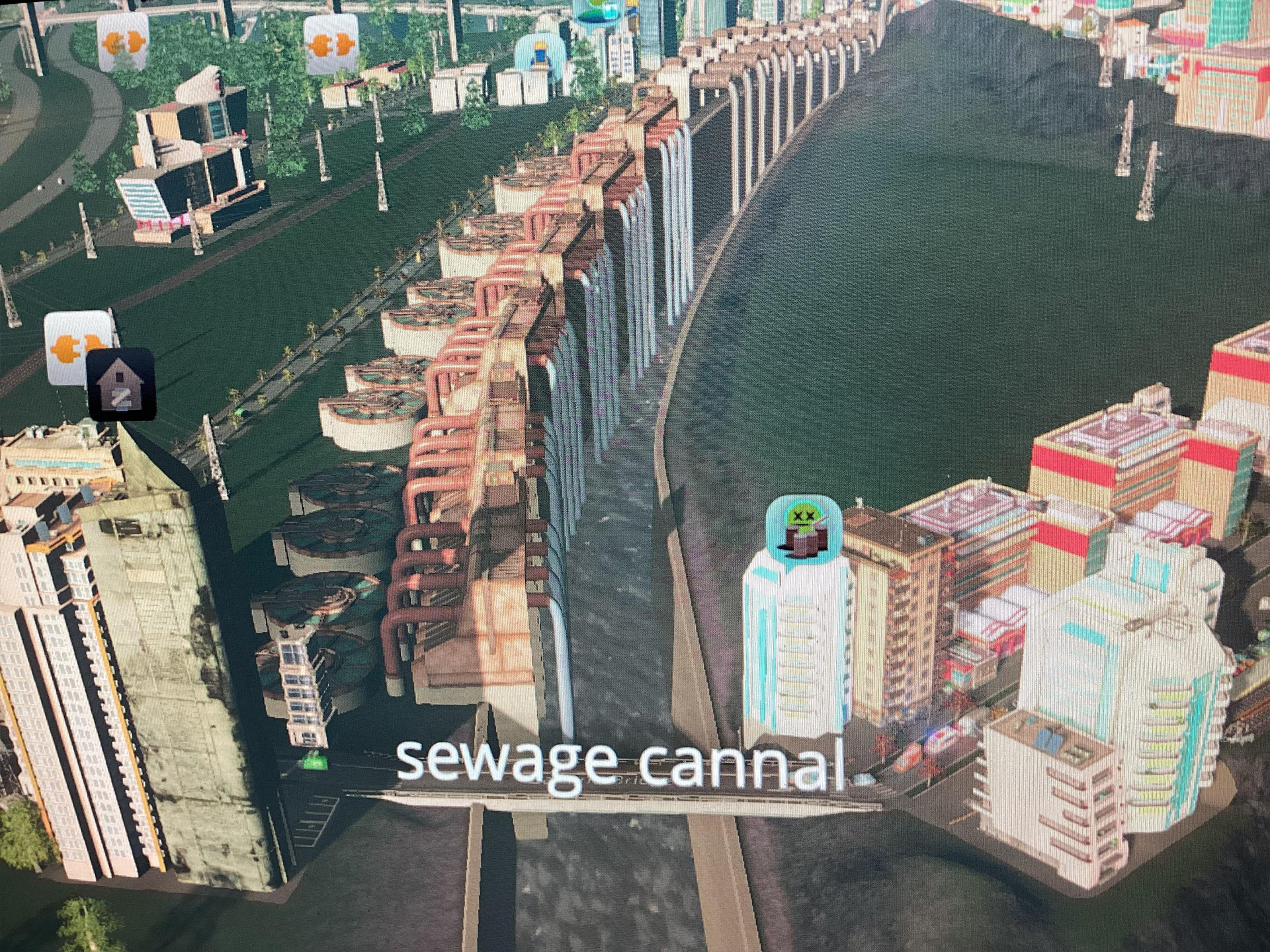Канализационный канал, намеренно написанный с ошибкой как "sewage cannal", проходит прямо через центр города. Один из других игроков пошутил на эту тему: