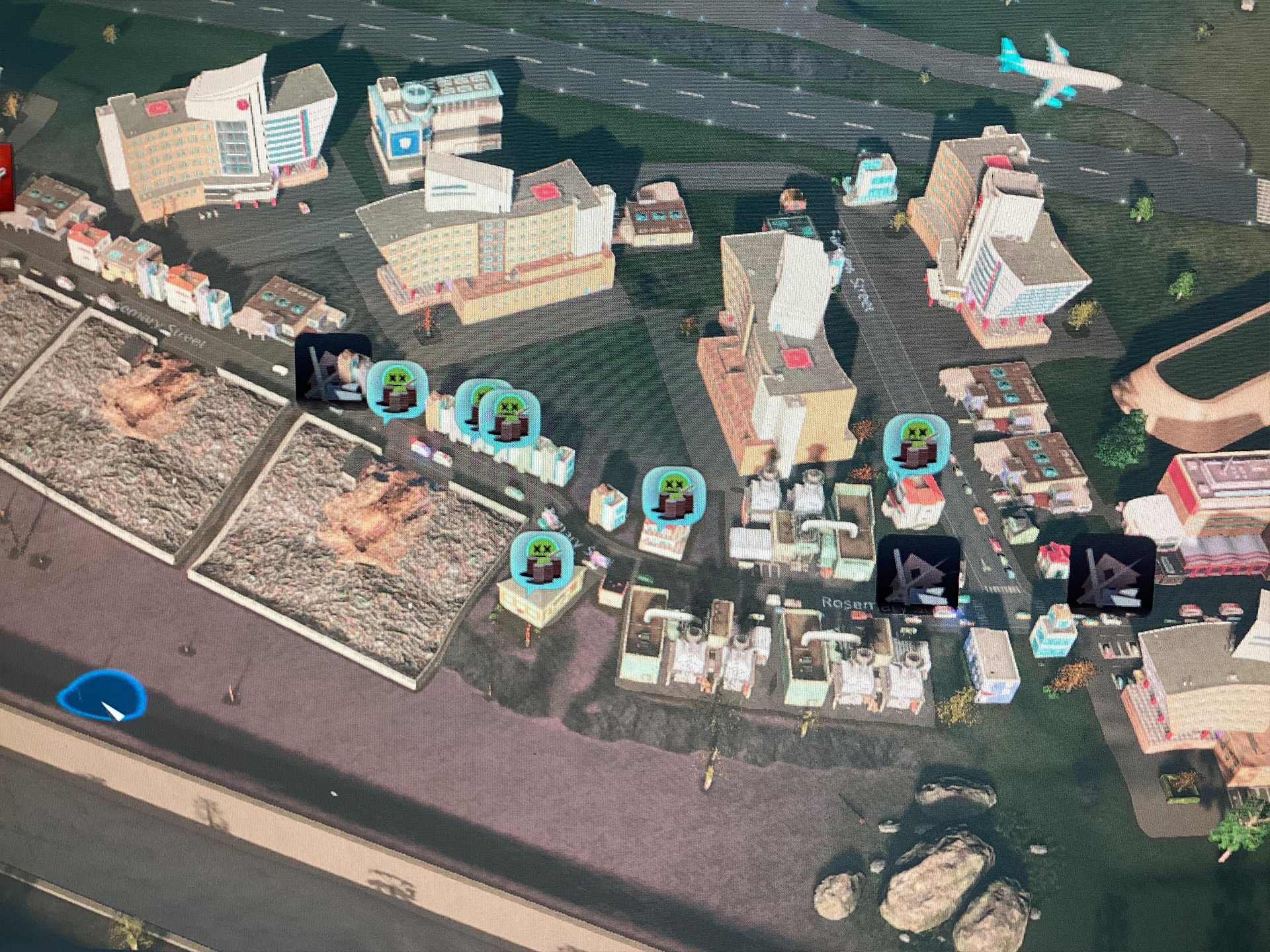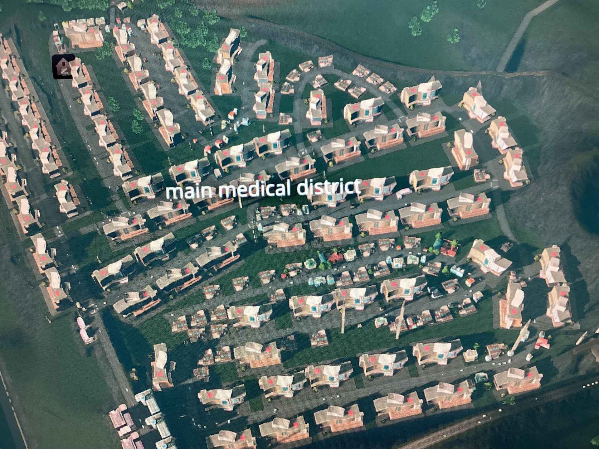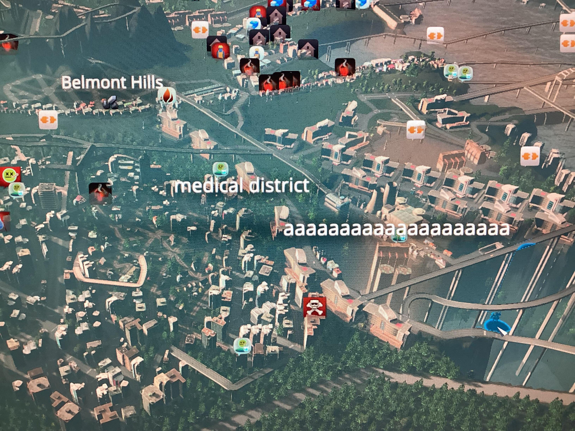 Особого внимания заслуживает район с названием "ааааааааааааа", расположенный рядом с медицинским районом, где сосредоточено невероятное количество больниц. Игрок объяснил их появление просто: