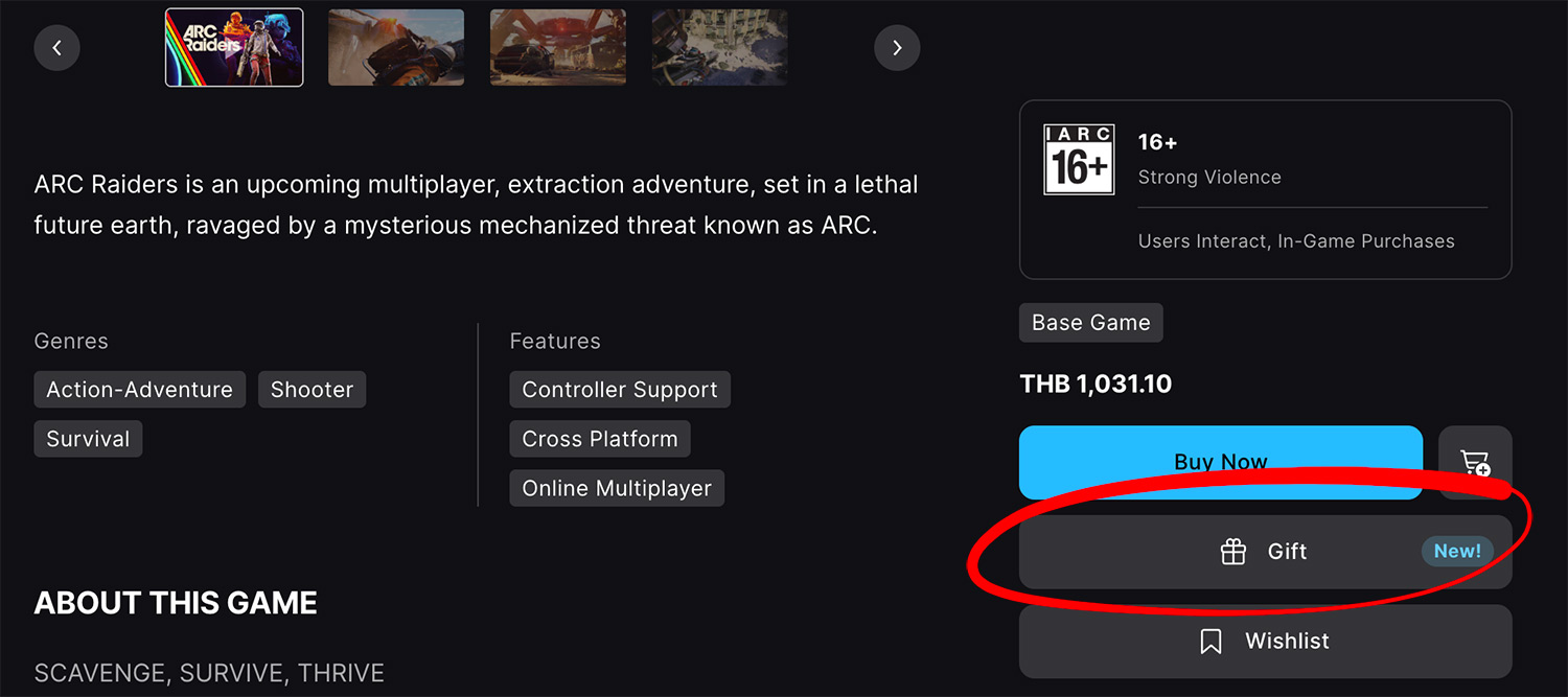 На странице игры в магазине теперь появилась кнопка Gift под стандартной кнопкой покупки. При нажатии система попросит войти в аккаунт Epic Games, затем ввести данные аккаунта получателя, выбрать одно из готовых сообщений и указать дату, когда подарок должен "прийти" к адресату.