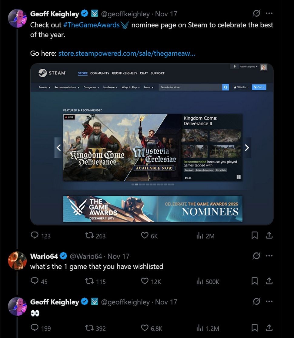 На этой неделе интернет охватила очередная волна спекуляций вокруг возможного анонса Half-Life 3. Все началось с невинного, казалось бы, поста Джеффа Кили, ведущего The Game Awards, который призвал подписчиков посетить страницу номинантов премии в Steam. К сообщению прилагался скриншот главной страницы магазина, на котором внимательные пользователи заметили интересную деталь – Кили находился в своем аккаунте, а в его списке желаемого значилась ровно одна игра.