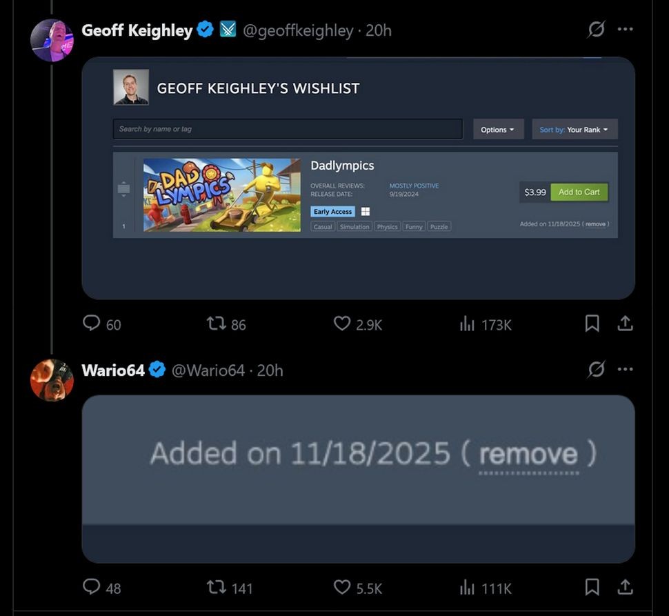 Спустя почти сутки Кили попытался погасить волнения, раскрыв карты. Судя по его скриншоту, единственной игрой в его списке желаемого оказался Dadlympics – мультиплеерный тайтл 2024 года с физическими головоломками. Он вышел в сентябре и достиг пикового онлайна в шесть человек одновременно.