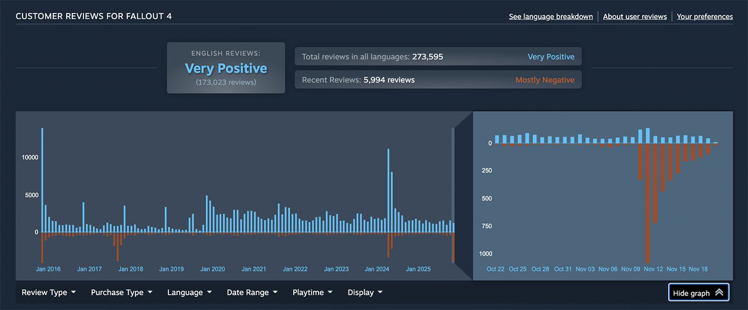 Недавние отзывы "в основном негативные", а глядя на график, последний раз подобное случилось в сентябре 2017 года, когда лишь 19% новых отзывов были положительными. Сейчас только 25% отзывов положительные – игроки явно недовольны состоянием Fallout 4.