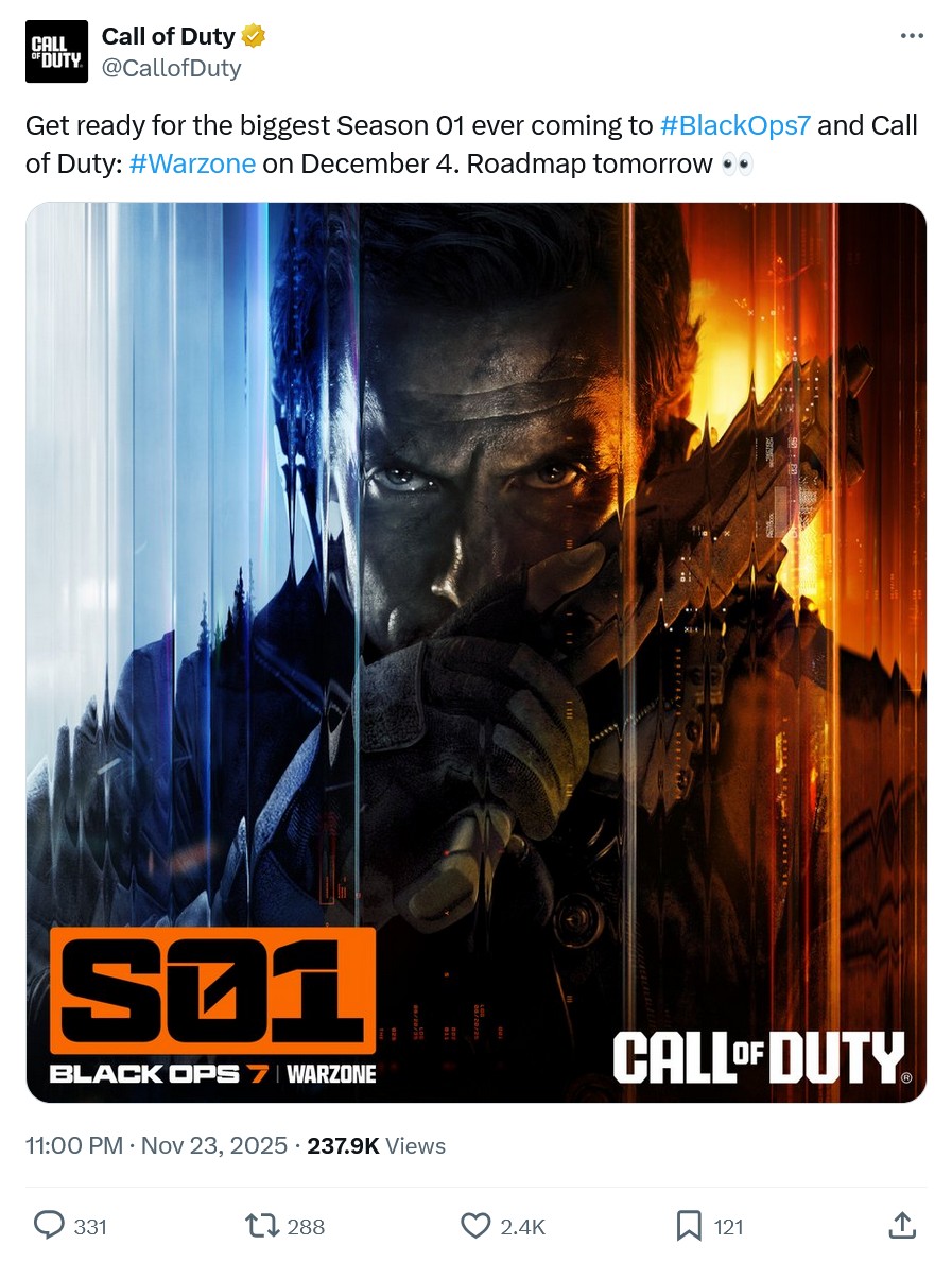 Activision анонсировала запуск первого сезона для Call of Duty: Black Ops 7 и Warzone, который состоится 4 декабря. Издатель обещает, что обновление станет самым масштабным стартовым сезоном в истории франшизы. Детальная дорожная карта контента будет представлена уже скоро.