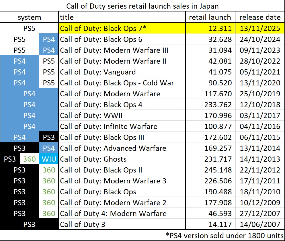 По данным @Zuby_Tech, розничные продажи Black Ops 7 в Японии за первую неделю составили всего 12 311 копий. Версия для PS4 добавила к этому показателю менее 1800 экземпляров. Для сравнения, даже Call of Duty 3, вышедший в 2007 году, продался тиражом в 14 117 копий на старте. Фактически, Black Ops 7 стала худшей игрой серии по стартовым продажам в Японии за всю доступную историю подсчетов.