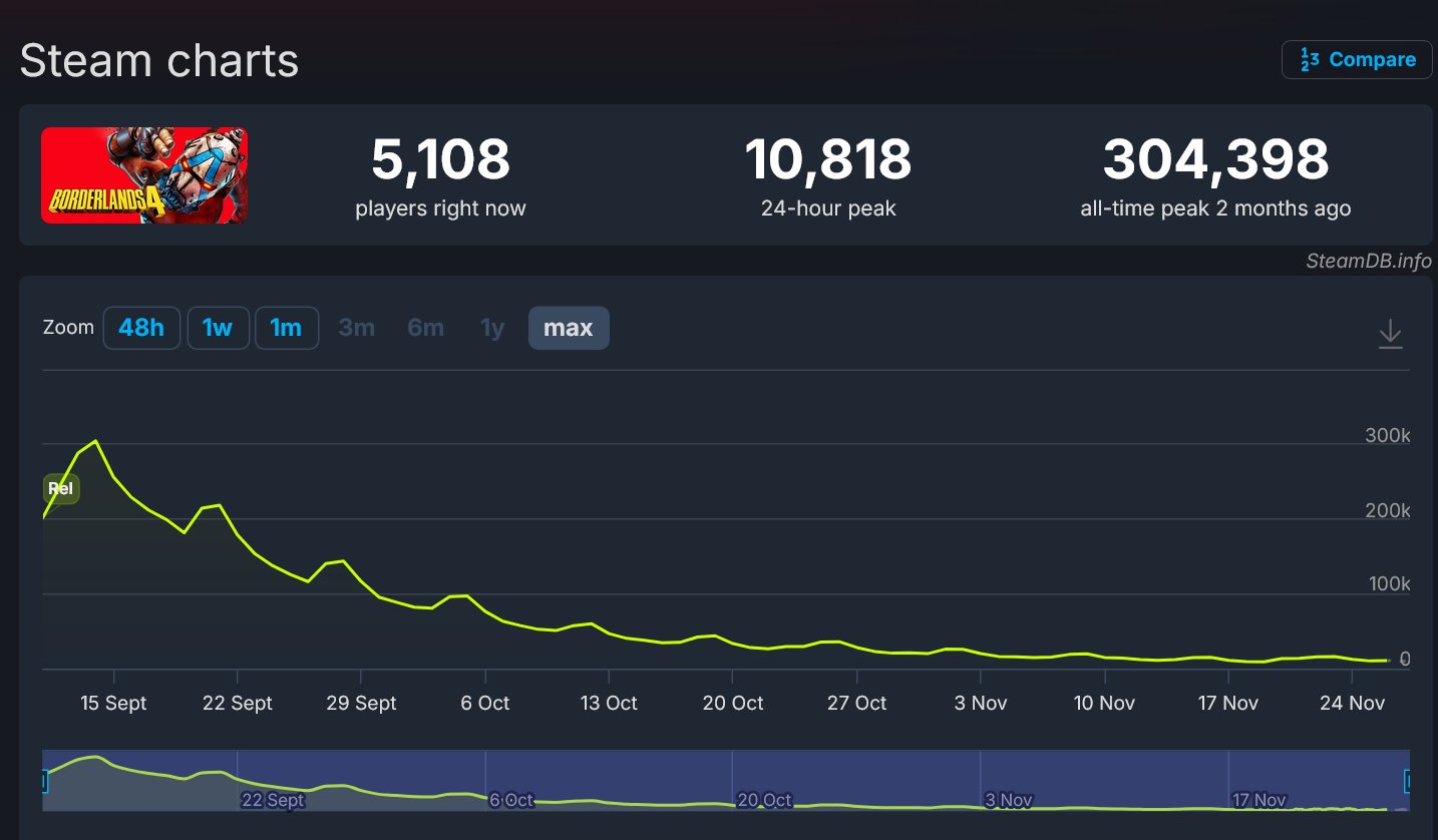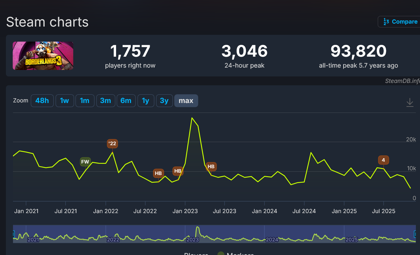 Несмотря на падение, Borderlands 4 остается самой успешной игрой франшизы в Steam и превосходит показатели предыдущих частей серии – у Borderlands 3 пик был в 933820 человек, а затем снижался до 15-10 тысяч.