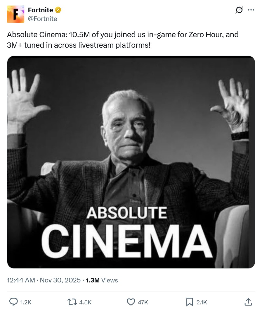 Epic Games подвела итоги живого события Zero Hour в Fortnite, которое стало финалом текущей главы. В битве одновременно участвовали 10,5 миллиона игроков, а еще более 3 миллионов человек следили за происходящим через стримы на различных платформах.